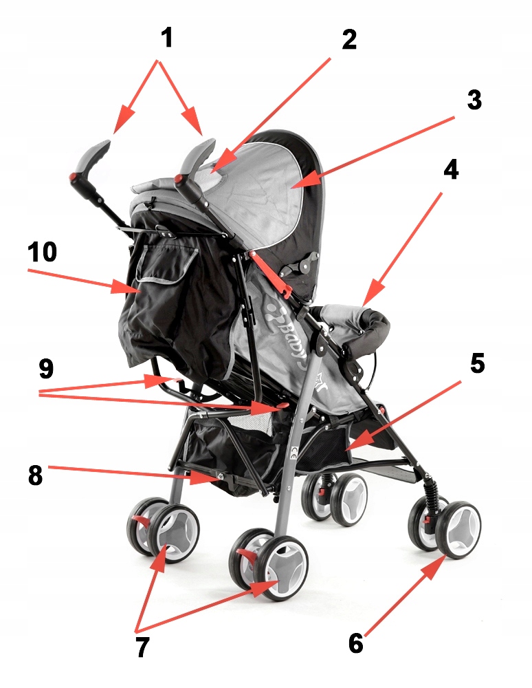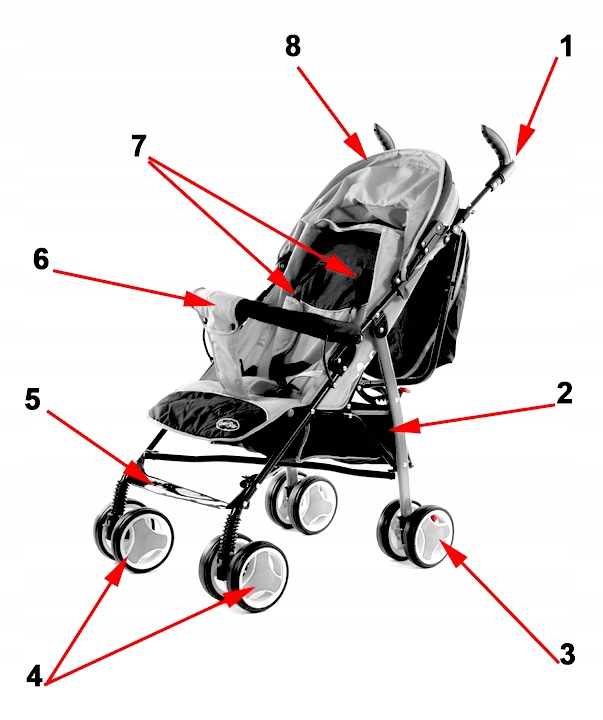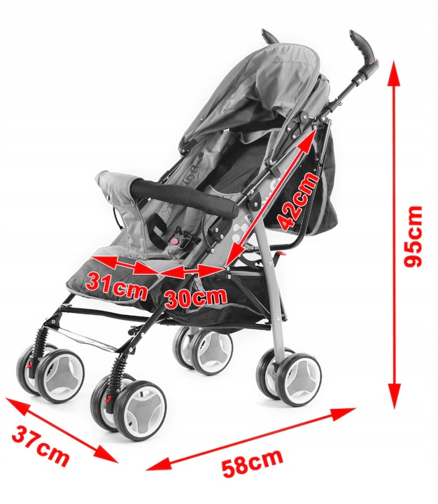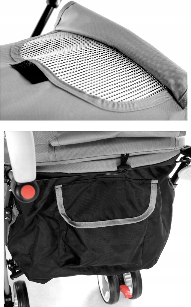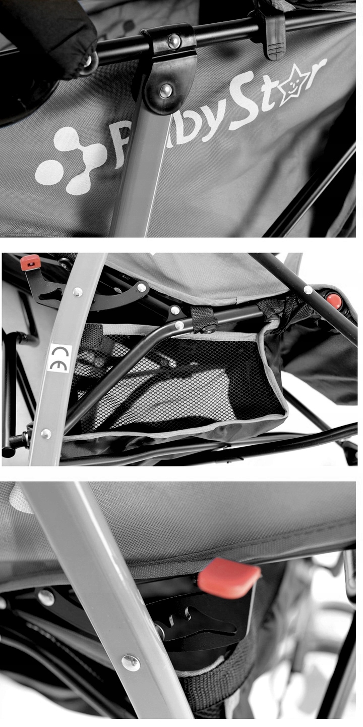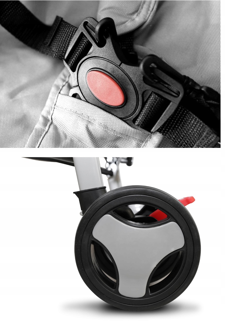 Trdna konstrukcija Okvir je izdelan iz visokokakovostnih kovin, zato se ne bo deformiral niti med dolgotrajno uporabo. Voziček tehta nekaj več kot 7 kg.