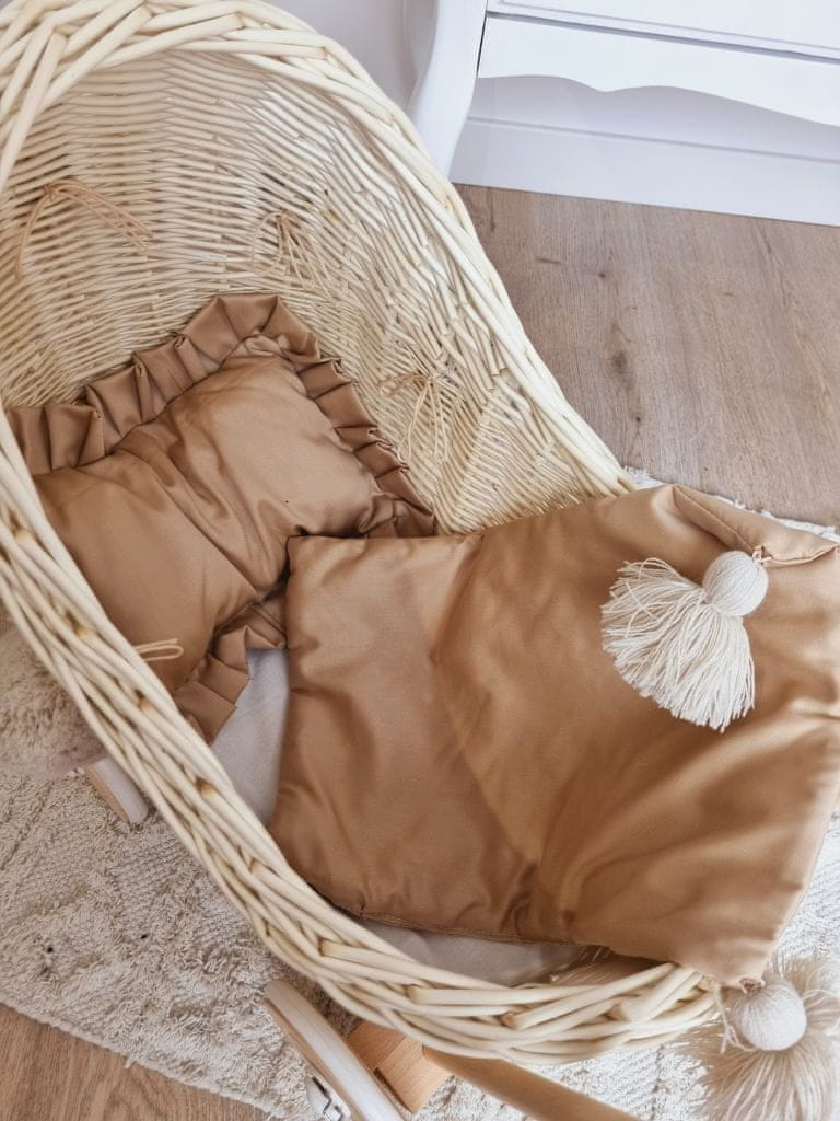 Voziček za punčke iz pletenega ekru barve s cofki in posteljnino – lesen Celoten opis