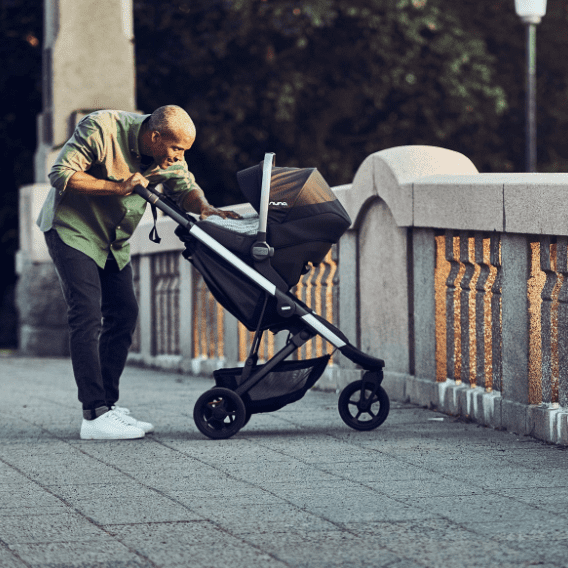 Kolesa imajo zavoro, na strešici, ki ščiti pred sončnimi žarki, pa je mrežasta tkanina, ki omogoča pogled na malčka.