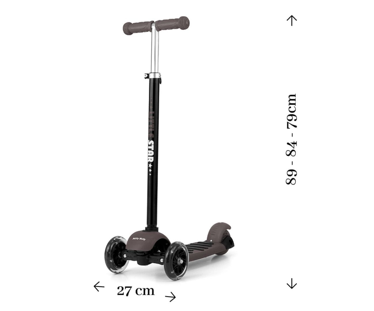 Svetli, svetli, zvezdica, kako se sprašujem, kaj si … Ko se mali raziskovalec odpravi osvajat svet … Skiro LITTLE STAR se bo prilagodil starosti in potrebam vašega otroka. Zvezdica bo vašemu otroku omogočila najboljši začetek. Da bi zadostili potrebam naših „Zvezdic“, smo ustvarili trikolesni skiro LITTLE STAR, ki spada v družino izdelkov GROW UP – raste z vašim otrokom. Popolna rešitev za aktivne malčke, ki so nenehno v gibanju. Kaj je Zvezdica? Ni samo skiro, ampak tudi igrača za otroke od drugega rojstnega dne dalje, ki bo z vašim otrokom sledila tudi skozi nadaljnje razvojne faze … Starševski ročaj vam omogoča, da otroka podprete, ko je na primer izčrpan po dolgem dnevu z Zvezdico ali mora premagati večjo oviro. Rešitev LITTLE STAR 3 v 1 za minimaliste … MillyMally-sts), ki cenijo udobje in preprostost v sodobnem dizajnu. MALA ZVEZDA v 3 korakih: Otroško kolo za malčke – zahvaljujoč dvojnim sprednjim kolesom in starševskemu ročaju je idealno za učenje vožnje njihovega prvega „kolesa“, ki bo sčasoma postalo skiro. Samostoječe poganjalo za aktivne malčke – idealno za otroka, ki se pogumno podaja v svet (največja nosilnost: 20 kg). Otroški skiro – nudi obilo zabave in je odlična rešitev za aktivno preživljanje prostega časa. Največja nosilnost: 50 kg. Značilnosti izdelka: lahka in trdna konstrukcija (aluminij, steklena vlakna, PVC) upravljanje z ročajem – za starše, ojačitev sedeža z dodatnim „okvirjem“ udobni ročaji upravljanje – obračanje deluje z rahlim nagibanjem 3-stopenjska nastavitev višine ročaja udoben mehak konturiran sedež trikolesni skiro (vozilo) zagotavlja stabilnost starostna skupina 2+ trpežna in nedrseča platforma opremljena z zavoro – zadnji blatnik sprednja kolesa svetleča kolesa iz visokokakovostnega materiala (guma) zagotavljajo pravilen oprijem in tiho vožnjo TEHNIČNI PODATKI DIMENZIJE: višina 79–100 cm dolžina 57 cm širina 27 cm višina sedeža od tal 27 cm premer koles: spredaj – 12 cm, zadaj – 10 cm največja obremenitev kolesa do 20 kg, skiroji do 50 kg teža 4,1 kg EMBALAŽA: višina 28 cm širina 16,5 cm dolžina 60,5 cm količina v škatli: 1 kos teža z embalažo 4,6 kg navodila za sestavljanje garancija: 1 leto