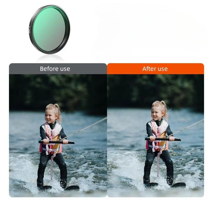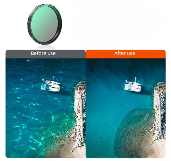 DJI OSMO ACTION 3 4 5PRO . To je visokokakovostno optično steklo s posebnimi premazi, ki ščitijo lečo pred praskami, prahom in umazanijo. UV-filter blokira ultravijolično svetlobo, s čimer preprečuje zamegljenost fotografij in zagotavlja ostre ter jasne slike. Priložena je tudi torbica za enostavno shranjevanje. POLARIZACIJSKI FILTER CPL NANO