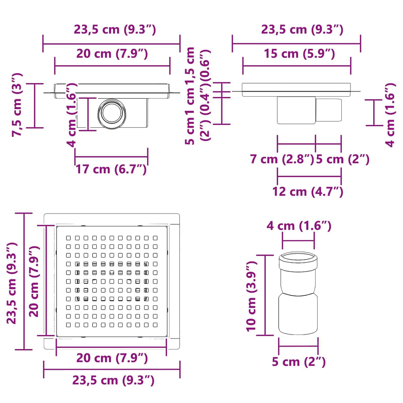 Vidaxl Dot odtočna naprava srebrna 20 x 20 cm Nerjaveče jeklo 304