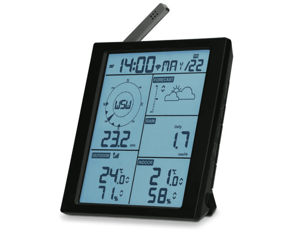 Na podlagi podatkov in zgodovine v realnem času se izračuna tudi temperatura občutka, toplotni indeks in rosišče ter vremenska napoved za naslednjih 24 ur. Ta profesionalna vremenska postaja je opremljena z dežemerom za beleženje količine padavin. Po želji lahko nastavite več alarmov za najvišje in najnižje vrednosti temperature, vlažnosti in padavin. Vremenska postaja ima pomnilnik najnižjih in najvišjih izmerjenih vrednosti.