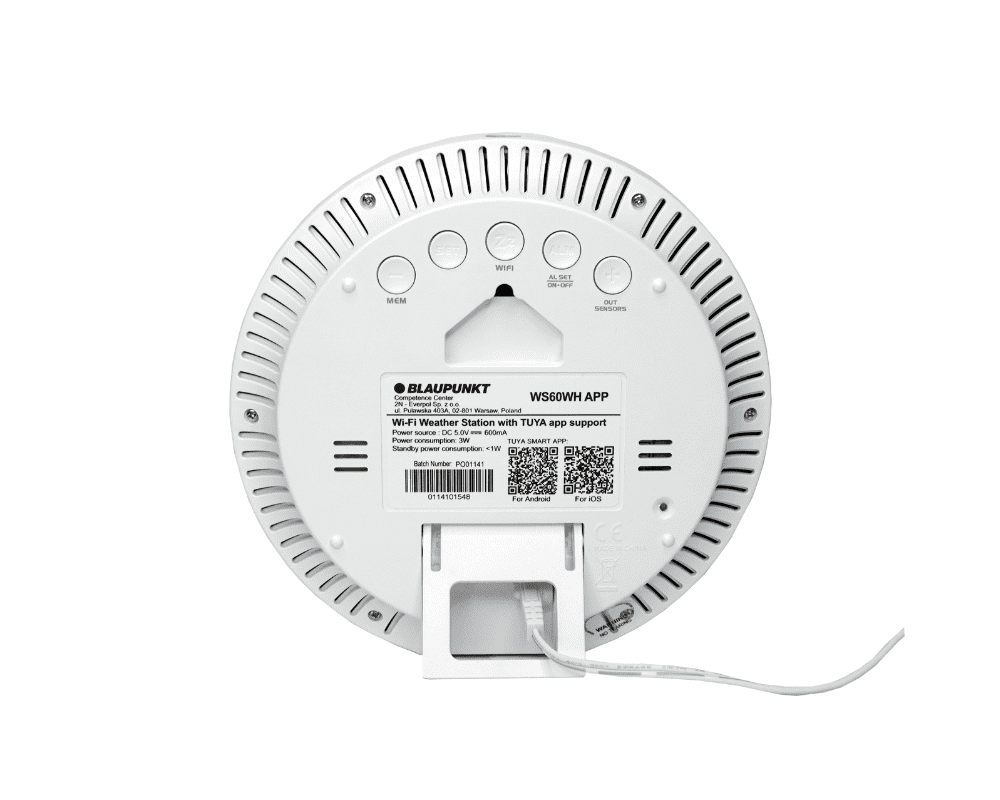 Blaupunkt WS60WH APP je napredna vremenska postaja s funkcijo spremljanja kakovosti zraka. Prepoznavno okroglo ohišje v beli barvi je opremljeno z enobarvnim LCD zaslonom, ki je praktičen in estetsko privlačen dodatek k vsaki notranjosti.