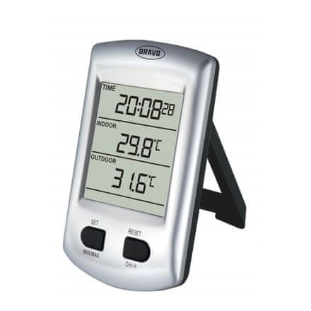 Sodobna brezžična vremenska postaja Bravo B 5053 omogoča natančno merjenje notranje in zunanje temperature s pomočjo oddaljenega zunanjega senzorja. Idealna je za vsakodnevni pregled vremenskih razmer doma ali v pisarni.
