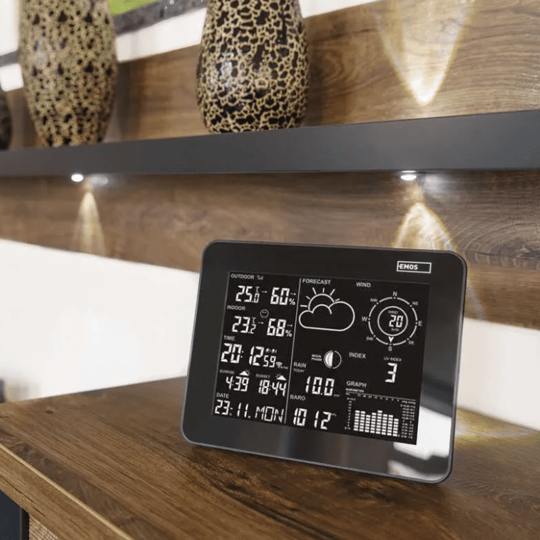 Brezžična Smart meteorološka postaja z LED osvetlitvijo zaslona, 12/24 urni formatom, možnostjo obešanja na steno ter elektronsko osvetlitvijo površine.