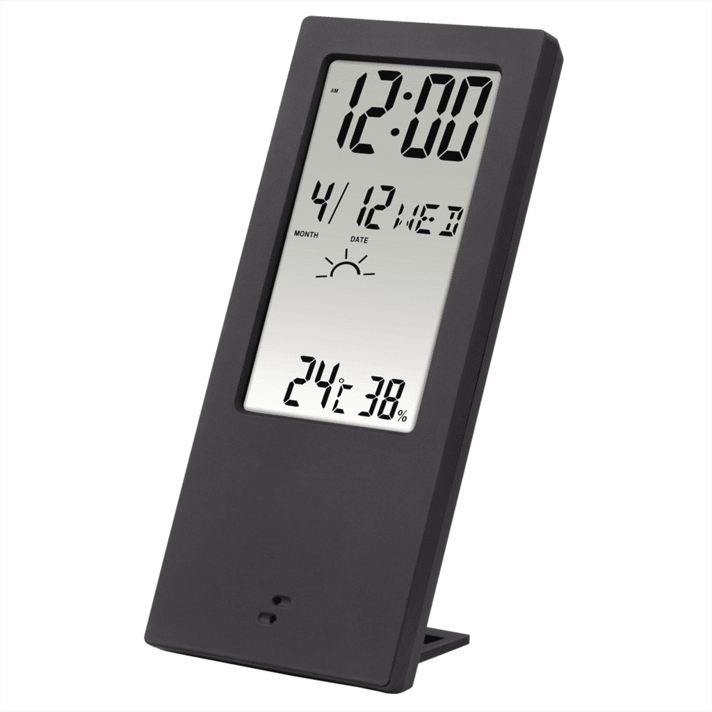• digitalni prikaz temperature in vlažnosti, časa in vremenskega trenda – vreme prikazano s simboli: sončno, oblačno, dež – prozoren zaslon, odčitki vidni z obeh strani – raztegljiv in nagiben …