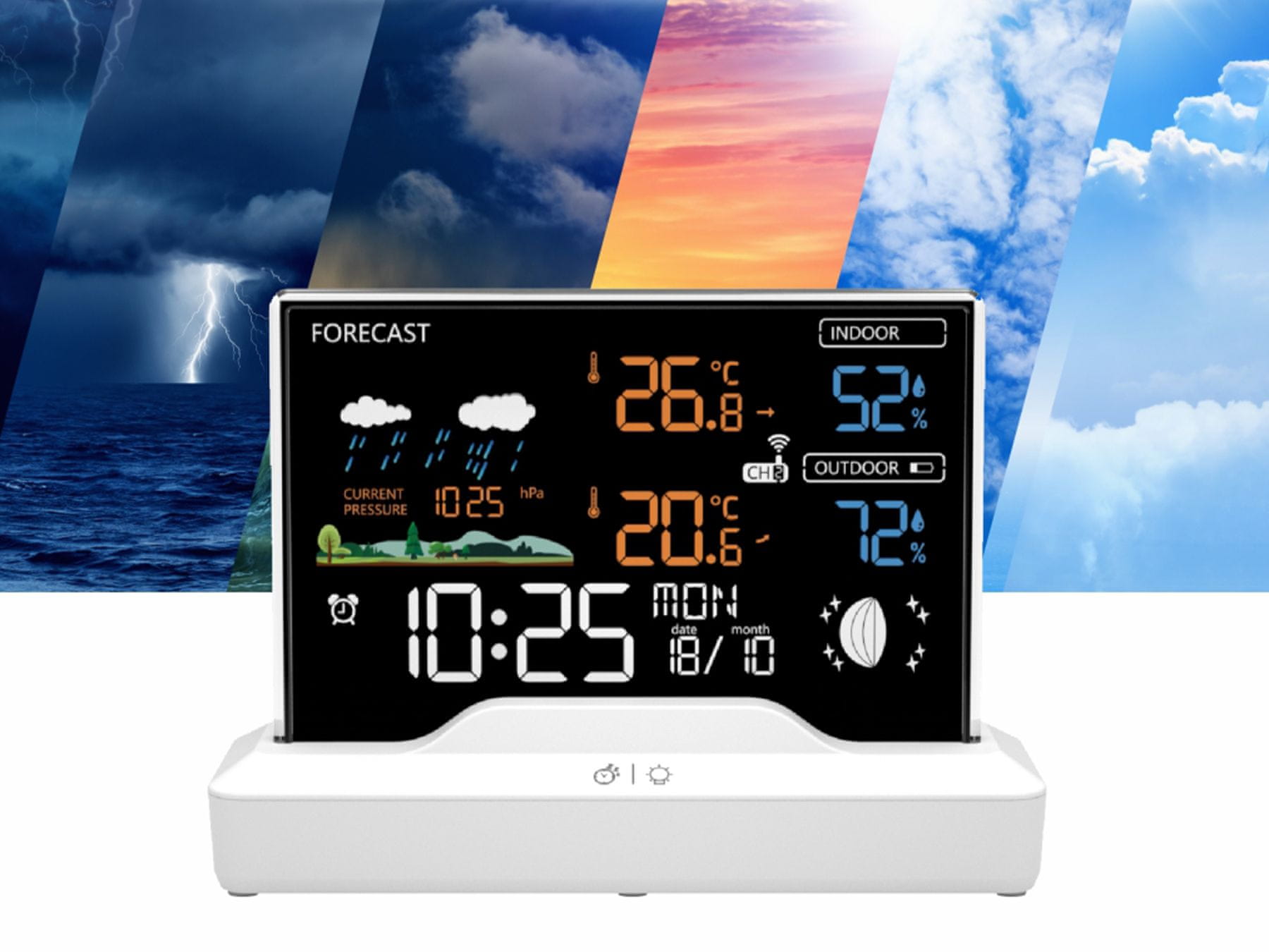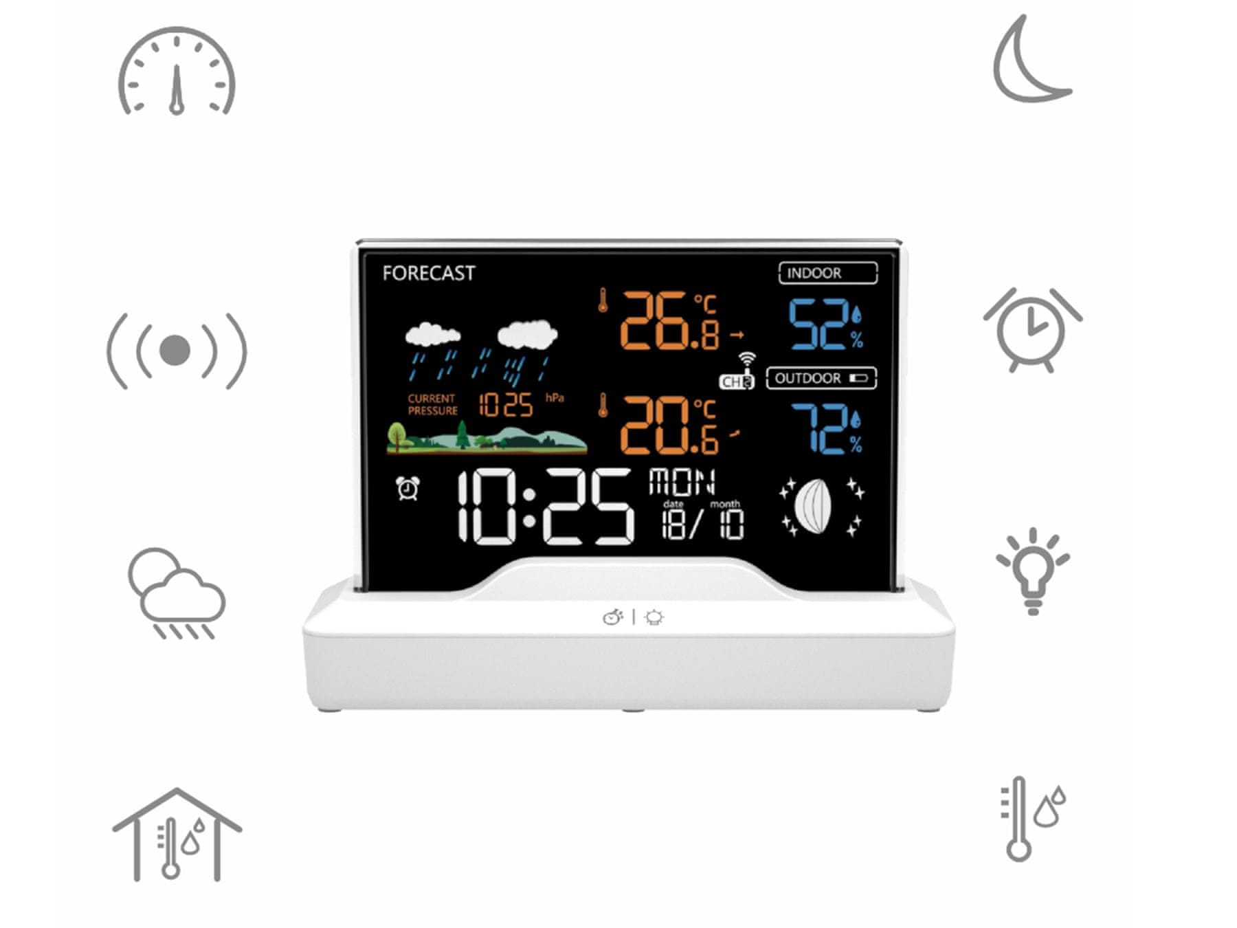 | Prikaz | čas, datum, vremenska napoved, notranja temperatura, zunanja temperatura, vlažnost, tlak (barometer), alarm / budilka, lunine mene |