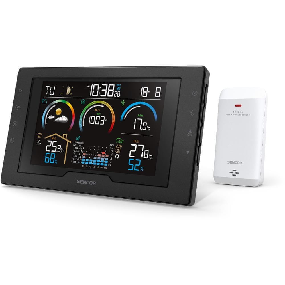 Weather Smart Vremenska postaja SENCOR SWS 8000 je idealna izbira za tiste, ki želijo spremljati vreme in ohranjati zdravo okolje v domu. Na preglednem 5,7" barvnem LCD-zaslonu so prikazane najnovejše informacije o notranji in zunanji temperaturi, vlažnosti in barometričnem tlaku. Prikazuje tudi vremensko napoved za 12 do 24 ur – z enostavno razumljivimi ikonami (sončno, oblačno, dež, nevihta ali sneg). Meritve dopolnjujejo graf gibanja tlaka, indikator udobja in opozorilo za ekstremne vrednosti meritev. Postaja lahko občutljive ljudi opozori na morebitne zdravstvene težave, ki jih povzročajo vremenske spremembe.
