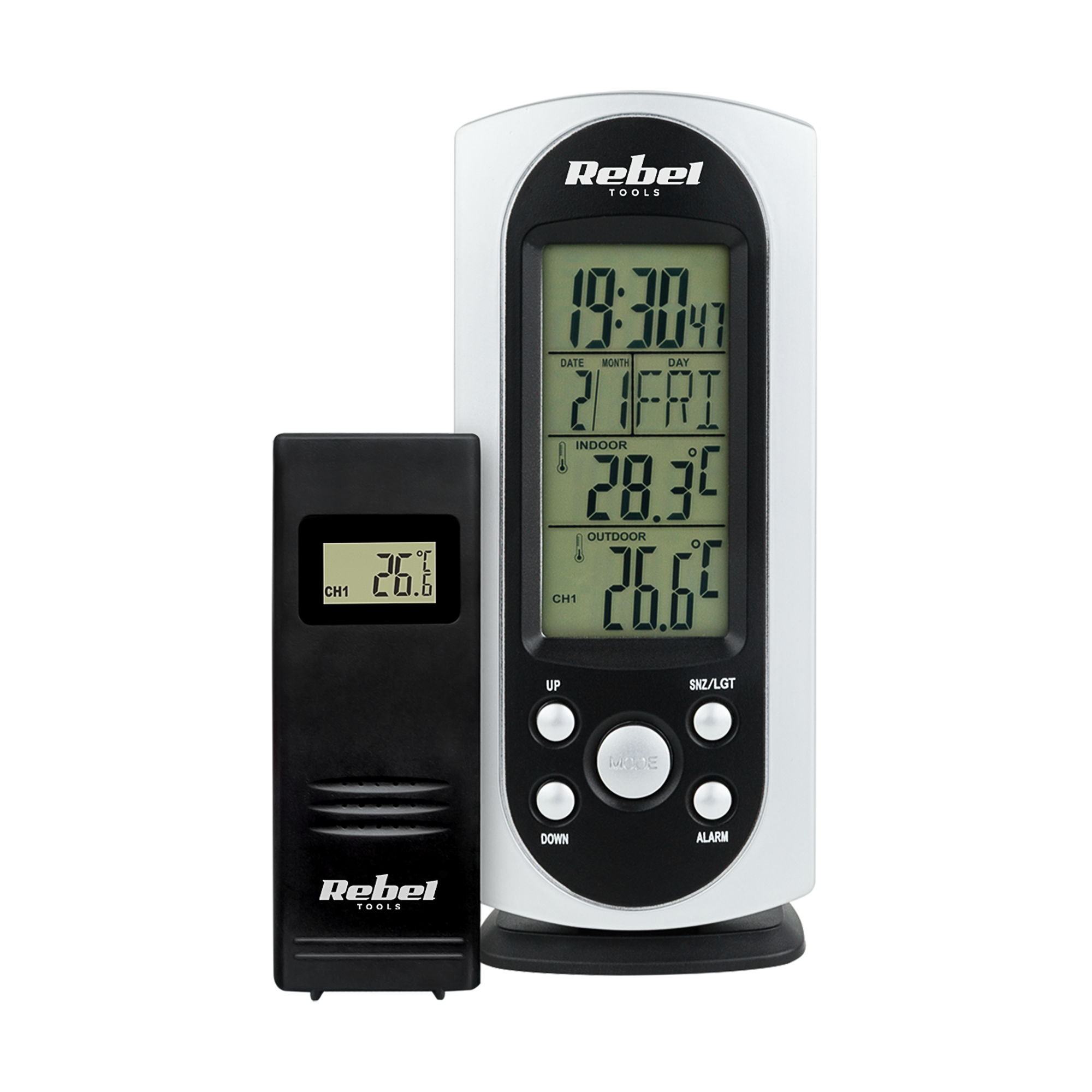 Vremenska postaja deluje na frekvenci 433 MHz, kar zagotavlja stabilno povezavo z zunanjim senzorjem, ki spremlja temperature od –30°C do +60°C. Sama postaja ima območje delovanja od 0°C do +50°C. Naprava prikazuje uro, datum in dan v tednu ter ima funkcijo alarma in dremeža, zaradi česar je vsestranski dodatek za vsak prostor.