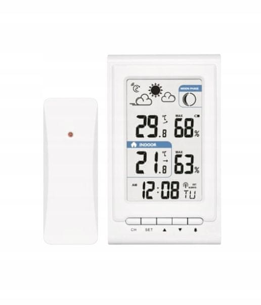 Brezžična vremenska postaja s senzorjem E0352 Brezžična vremenska postaja E0352 s senzorjem je moderna in estetsko oblikovana vremenska postaja. Izdelek ima številne uporabne funkcije, kot so: koledar, budilka s ponavljajočim se alarmom in časovni pasovi. Termometer meri zunanjo in notranjo temperaturo ter vlažnost. Ta izdelek odlikuje visokokakovostna izdelava. Doseg senzorja do 30 m. Parametri: Napajalnik: ne Doseg senzorja: do 30 m Barometer: ne Dimenzije zaslona: 50 × 81 mm Možnost montaže na steno: da Zunanja temperatura: od –40 °C do +60 °C, ločljivost 0,1 °C Zunanja vlažnost: od 20 % do 95 % relativne vlažnosti, ločljivost 1 % Vremenska napoved: da Ura: DCF (radijsko vodena) min. in maks. temperatura: da lunine mene: da datum: da trend tlaka: ne zasnova termometra: brezžična postaja napajanje: 2× 1,5 V AAA (nista priloženi) koledar: da notranja temperatura: –10 °C do +50 °C, ločljivost 0,1 °C dežemer: ne trend temperature: da osvetlitev ozadja LED zaslona: ne nastavitev nadmorske višine: ne 12/24-urni format časa: da napajanje senzorja: 2× 1,5 V AA (nista priloženi) budilka: da notranja vlažnost: 1 % do 99 % relativne vlažnosti, ločljivost 1 % anemometer: ne časovni pasovi: da ponavljajoči se klic bujenja: da temperaturne enote: °C/°F frekvenca: 433 MHz dimenzije senzorja: 21 × 38 × 100 mm.