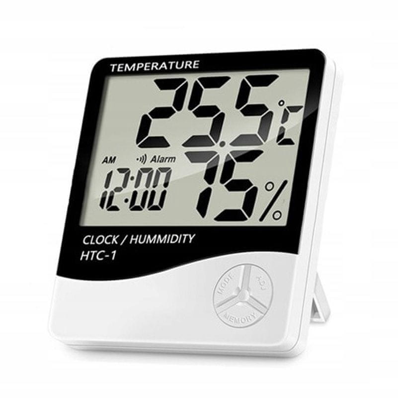 Vremenska postaja s termometrom, alarmom in merjenjem vlažnosti Postaja natančno meri temperaturo in vlažnost okolice. Bodite vedno na tekočem z našo vremensko postajo! Opremljena s termometrom, alarmom in merjenjem vlažnosti, vam bo ta vremenska postaja zagotovila natančne informacije o vaši okolici. LCD zaslon omogoča enostavno odčitavanje meritev, intuitivni uporabniški vmesnik pa izjemno enostavno upravljanje vremenske postaje. Kompaktna zasnova vremenske postaje pomeni, da jo lahko postavite kjerkoli v vašem domu ali pisarni. Funkcija baterijskega napajanja vam omogoča prosto uporabo naprave brez dostopa do električnega omrežja. Naša vremenska postaja ni samo merilna naprava, ampak tudi lep okras notranjosti. Zaradi minimalističnega dizajna in elegantnega zaključka se odlično prilega vsakemu prostoru. Postaja prikazuje tudi čas in se lahko uporablja kot ura. Izdelek, ki je na voljo v naši ponudbi, prikazuje temperaturo v °C in °F. Naprava je enostavna za uporabo. Napaja se z eno AAA baterijo – varčna (priložena) Naprava je kompaktna, večnamenska: Ura – lahko se uporablja kot navadna ura Budilka Vremenska postaja – merjenje vlage in temperature Specifikacija koledarja: Območje merjenja temperature: od –10 °C do +50 °C Natančnost meritve: +/- 1 °C Ločljivost meritve: +/- 0,1 °C Območje merilnika vlažnosti: 10% – 99% relativne vlažnosti Merilnik vlage z natančnostjo merjenja: +/- 5% RH Ločljivost vlage: 1% Baterija: 1× AAA 1,5V (priložena) Funkcija časa: koledar, ura Gumb na sliki zraven prikazuje, kako preprosto je spremeniti funkcijo prikaza temperature v °C in °F Napravo napaja ena AAA baterija (priložen), zaradi česar je energijsko varčen in omogoča njegovo hitro zamenjavo. Baterije so na voljo skoraj v vsaki trgovini! Priloženo: Digitalni higrometer s termometrom in uro Uporabniški priročnik Baterija