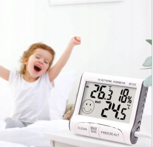 VREMENSKA POSTAJA TERMOMETER HIGROMETER + SONDA BREZ BATERIJE!!! SPECIFIKACIJA: Merilno območje notranje temperature: –10 C do 50 C Merilno območje zunanje temperature: –50 C do 70 C Merilno območje vlažnosti zraka: 20% do 99% Delovna temperatura zaslona: –10 C do 50 C Natančnost merjenja temperature: 0,1 C Natančnost merjenja vlažnosti: 1% Napajanje: 1× baterija (priložena) Funkcija pomnjenja najvišje in najnižje temperature vrednosti: da Snemljiva sonda za merjenje zunanje temperature: da (priložena) Dimenzije naprave: 75mm x 70mm x 15mm Magnet za pritrditev postaje na kovinske površine na hrbtni strani ohišja Higrometer je natančna naprava za merjenje vlažnosti zraka v prostoru ter temperature v zaprtih prostorih in na prostem. V kompletu je posebna sonda za zunanje meritve. Povežite ga z napravo, drugi konec pa potisnite skozi okno. Naprava ima stabilno stojalo na ohišju. Izdelek ima jasen LCD zaslon, ki prikazuje vse vrednosti. Obstaja funkcija za shranjevanje in branje najnižjih in najvišjih vrednosti čez dan. Poleg tega se na zaslonu prikaže smešek, ki označuje, ali so zunanji pogoji udobni ali ne. Možno je oblikovati temperaturne enote (stopinje C / stopinje F). PREDNOSTI NAPRAVE Visoka natančnost merjenja Merjenje temperature zunaj in znotraj Pregleden prikaz Funkcija pomnilnika vrednosti Oblikovanje temperaturne enote KOMPLET VKLJUČUJE: Originalno digitalno vremensko postajo Zunanjo merilno sondo 1,5V AG13 baterije Originalno proizvajalčevo pakiranje