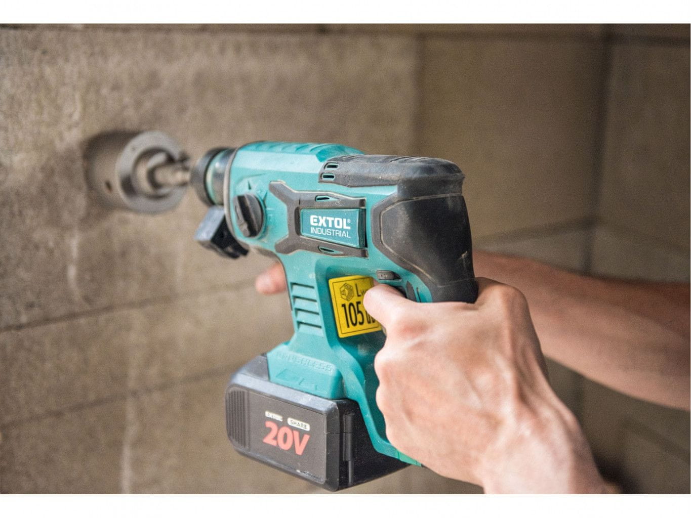 Akumulatorski vrtalni kladivo je zasnovano za hitro vrtanje v opeko in beton s svedri SDS plus ter za manjša dela pri sekanju. Kladivo poganja najsodobnejši brezkrtačni motor. Ta nova vrsta motorja ima daljšo življenjsko dobo, je močnejša in porabi manj električne energije kot običajni motorji z ogljikovimi ščetkami. Zaradi pnevmatskega udarnega sistema lahko vrtate veliko hitreje in učinkoviteje kot udarni vrtalniki. Kladivo ima blokado dleta, tako da lahko pred sekanjem nastavite dlo v ustrezen položaj, kladivo pa ga bo med sekanjem držalo v tem položaju. Njegova glavna prednost je baterijski pogon, ki vam omogoča, da kladivo vzamete s seboj, kjer koli želite delati, ne glede na to, ali je na voljo električna napeljava. Kladivo je opremljeno z vzvratno prestavo za lažje odstranjevanje zataknjenega svedra in regulatorjem hitrosti, ki se lahko uporablja glede na material, ki ga je treba vrtati. Vgrajena osvetlitev LED ima zakasnjen izklop in sveti še nekaj sekund po izklopu kladiva. Za običajno delo zadostujeta ena ali dve 2000mAh bateriji, ki ju lahko hitro napolnite s hitrim polnilnikom, za zahtevnejše ali daljše delo pa priporočamo večje baterije s kapaciteto 4000–8000 mAh. Baterijo lahko uporabljate v vseh vrstah orodij EXTOL SHARE20V. Zaradi uporabljene litij-ionske tehnologije ga je mogoče kadar koli znova napolniti, ne da bi se zmanjšala njegova zmogljivost. Li-ionska baterija zelo počasi izgublja energijo zaradi samopraznjenja, zato je dolgo časa napolnjena in pripravljena za uporabo.