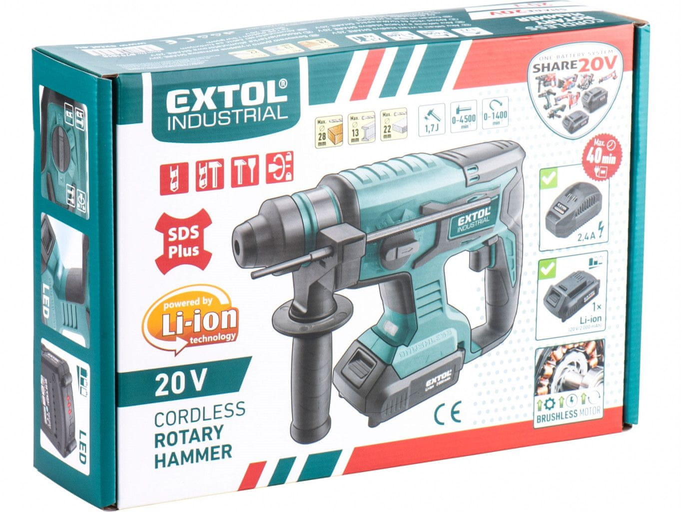 Extol Industrial Vrtalno kladivo jaz SHARE20V, 1,7J, SDS plus, BREZ KRTAČK, 20V Li-ion, 2000mAh