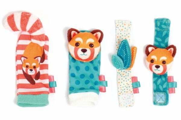 Ta komplet je sestavljen iz čudovitih nogavic in zapestnic, zasnovanih za malčke Nogavice imajo ropotajočo živalsko glavo in progast, šumeč rep, ki spodbujata prijemanje in raziskovanje Zapestnice z ježkom imajo piskačo in pisane liste, ki jih bodo malčki z veseljem stiskali in se jih dotikali Vsi deli so izdelani iz materialov z različnimi teksturami, ki spodbujajo njihove čute dotika, sluha in vida