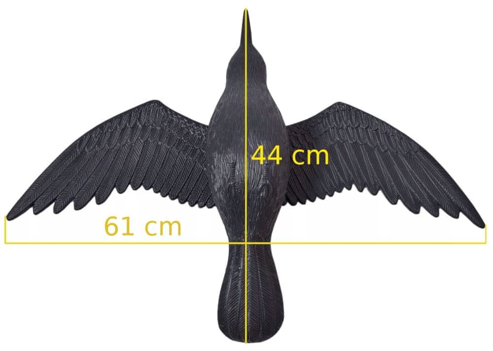 Krokar v letu – odganjalec golobov in drugih ptic. Predvidena uporaba: terasa, balkon, vrt | Barva: črna. Ta odganjalec v obliki krokarja odlično odganja majhne ptice, kot so golobi, sinice, kosi itd. Naš krokar zvesto posnema pravo ptico – tako po videzu kot po velikosti – zaradi česar je zelo uporaben in učinkovit. Ščiti drevesa in grmičevje pred pticami, ki se hranijo na vrtu ali vrtu, poleg tega pa pomaga ohranjati okenske police in verande čiste. Krokar je izdelan iz trpežne, vremensko odporne plastike. Krokar je tudi zanimiva vrtna dekoracija. Dimenzije izdelka: Razpon kril: 61 cm, dolžina: 44 cm, višina: 13 cm. Dodatne informacije: Prikazane barve so zgolj ilustrativne – zaradi različnih nastavitev monitorja in obdelave fotografij se lahko razlikujejo od dejanskih. Dejanske dimenzije se lahko razlikujejo od zgoraj navedenih. Toleranca napake je lahko +/- 5 %. Znamka: Gockowiak EAN koda: 5902340304365 Barva: črna Dolžina: 44 cm Razpon kril: 61 cm Višina: 13 cm Material: plastika