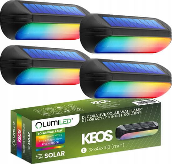 ⭐ Set 4× Solarna vrtna svetilka LED fasadna stenska svetilka KEOS znanega in priznanega podjetja LUMILED. Solarna vrtna svetilka za površinsko montažo, npr. na fasade stavb, ograje, balkone ali stopnice. Originalni svetlobni vir s toplo belo barvo (3000K), dodatno opremljen z večbarvno RGB svetlobo. Celoten opis