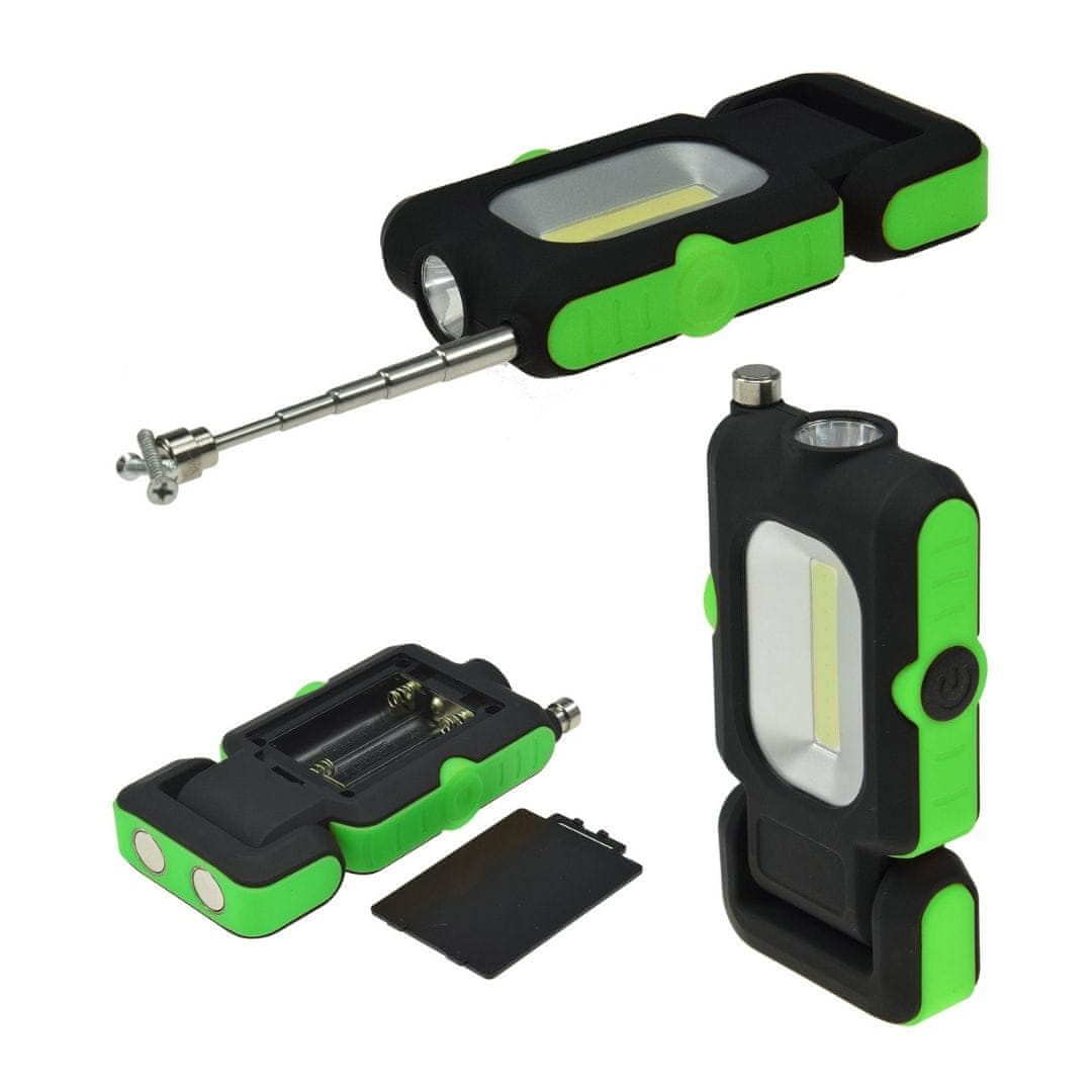 Ta priročna LED delovna svetlka deluje na baterije in je zato neodvisna od električne vtičnice. Nepogrešljiv pripomoček za vse dejavnosti, kjer je potrebna dobra osvetlitev delovnega območja (avtomehaniki, električarji, serviserji,…). Opremljena je z dvema magnetnima držaloma, kar pomeni, da lahko svetilko pritrdite na skoraj vse kovine vrtljivi spoj pa omogoča nastavitev kota svetlobe. Svetilka ima tudi teleskopsko palico z magnetom, ki je uporaben pri pobiranju majhnih vijakov ali drugih kovinskih delov. Poleg zelo svetle 3 W COB LED diode ima izdelek na vrhu tudi 1 W LED svetilko.