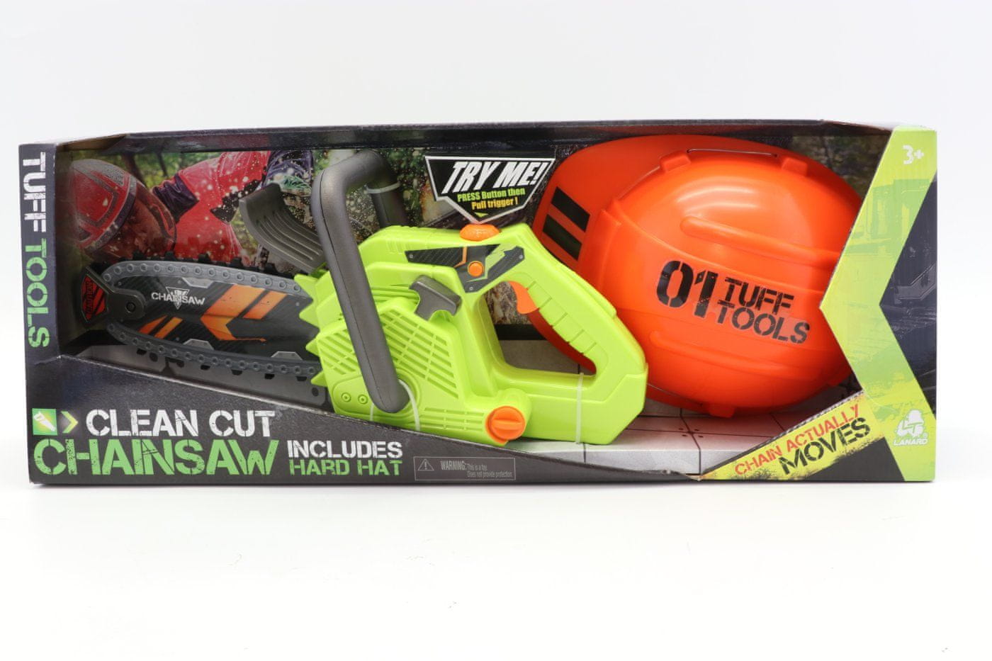 Motorna žaga in čelada. Ustvari zvočne učinke. Žago zaženete s pritiskom na gumb na strani. Z nadaljnjim pritiskom na sprožilec zaženete verigo, žaga pa proizvaja realistične zvoke rezanja. 3×AA baterije so priložene.