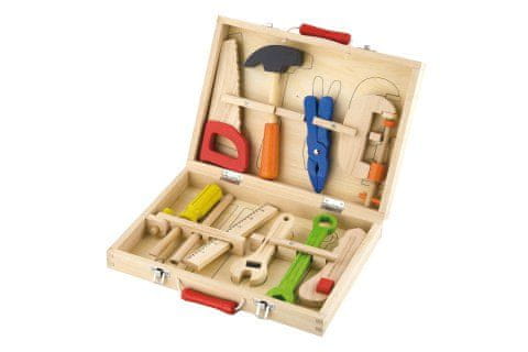 Leseno orodje je pakirano v praktičnem lesenem kovčku. Paket vsebuje skupno 10 orodij (kladivo, žaga, ključ, izvijač in drugo). Dimenzije približno 29 × 21 × 5,5 cm. Starost 3+