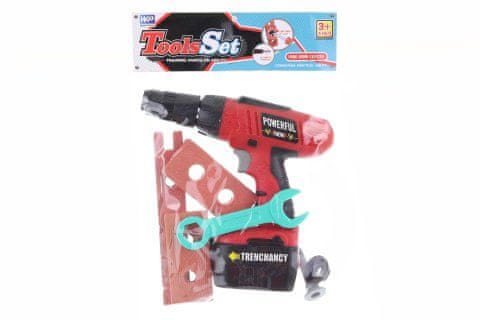Plastični vrtalnik na baterije z dodatki. Celoten opis