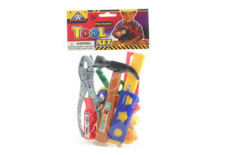 Komplet plastičnega orodja v vrečki. Vključuje kladivo, izvijač, klešče, merilni trak, vijake in drugo orodje. Dimenzije paketa približno 26 x15 × 4 cm. Starost 3+