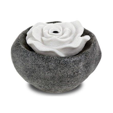 Vrtna fontana v obliki cveta vrtnice. Izdelana je iz poliresina v dekorju črnega kamnitega granita in cveta poliresina v dekorju belega peska. Curek vode osvetljujejo LED diode v hladnem modrem odtenku. Mini črpalka je električna 240V / 12V z brezstopenjsko regulacijo. Vrtne ali domače fontane so postale tradicionalni del našega življenja. Pravilno postavljene pomagajo pri pravilnem pretoku energije in ravnovesju, hkrati pa so prepoznaven dekorativni in funkcionalni element.