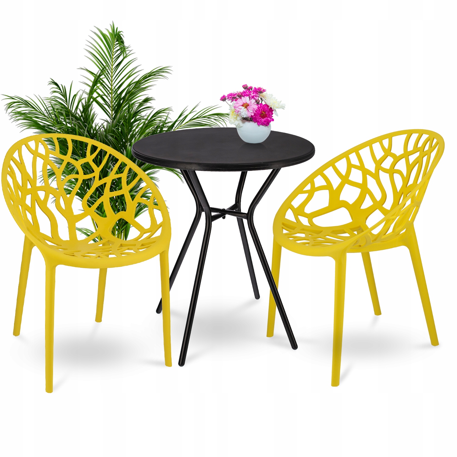 Prednost kompleta je, da so stoli izdelani iz enega kosa – ne potrebujejo montaže in so odporni na vremenske razmere , zato jih je mogoče uporabljati tako v zaprtih prostorih kot na prostem.