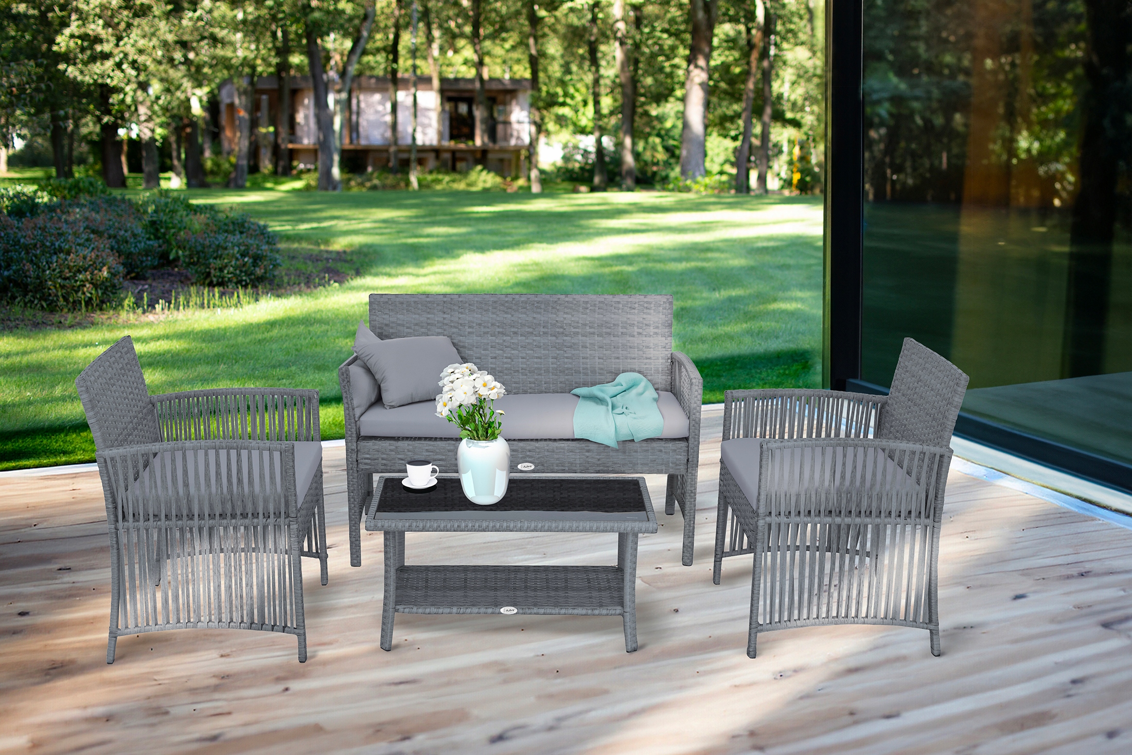 Komplet vrtnega pohištva, ki ustvarja počitniško vzdušje na prostem, npr. na balkonu, terasi ali na vrtu.