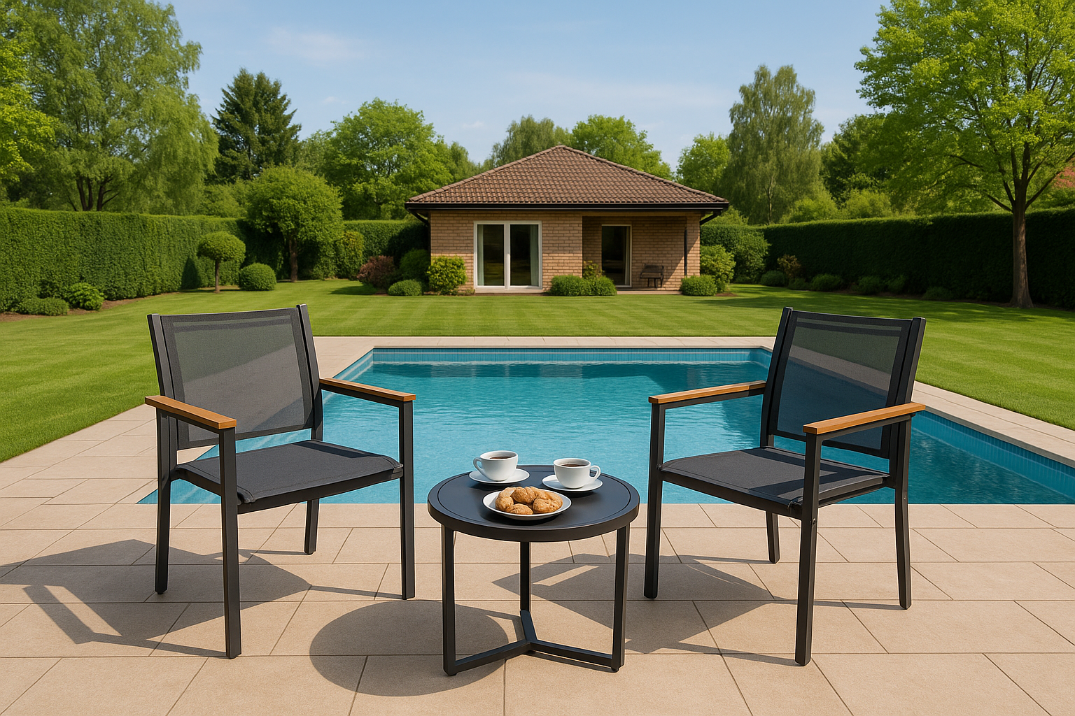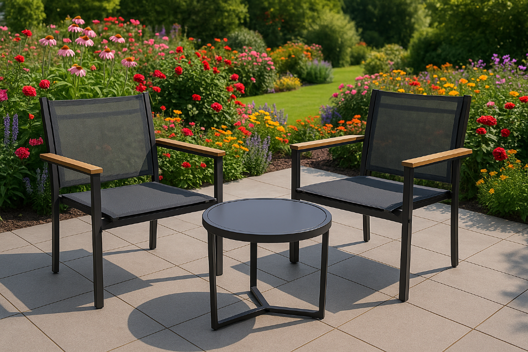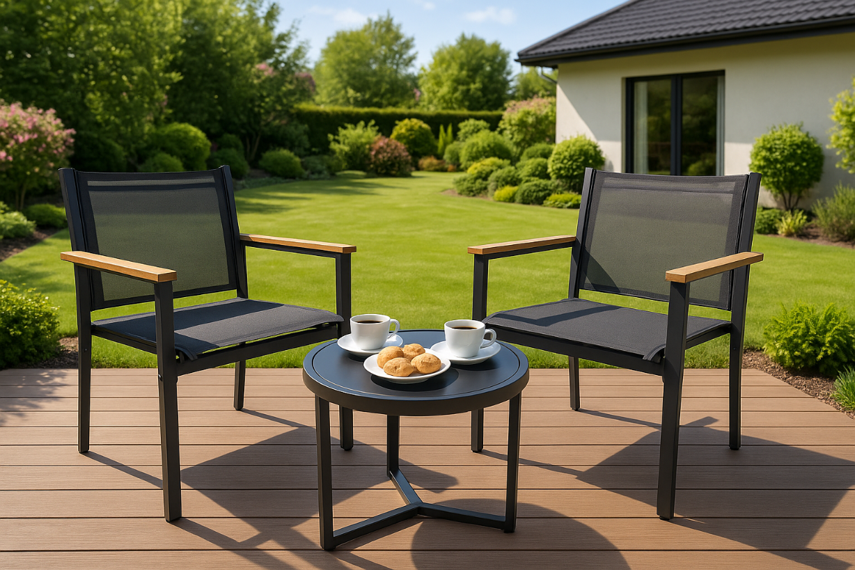 Komplet vrtnega pohištva, ki ustvarja počitniško vzdušje na prostem, npr. na balkonu, terasi ali vrtu.