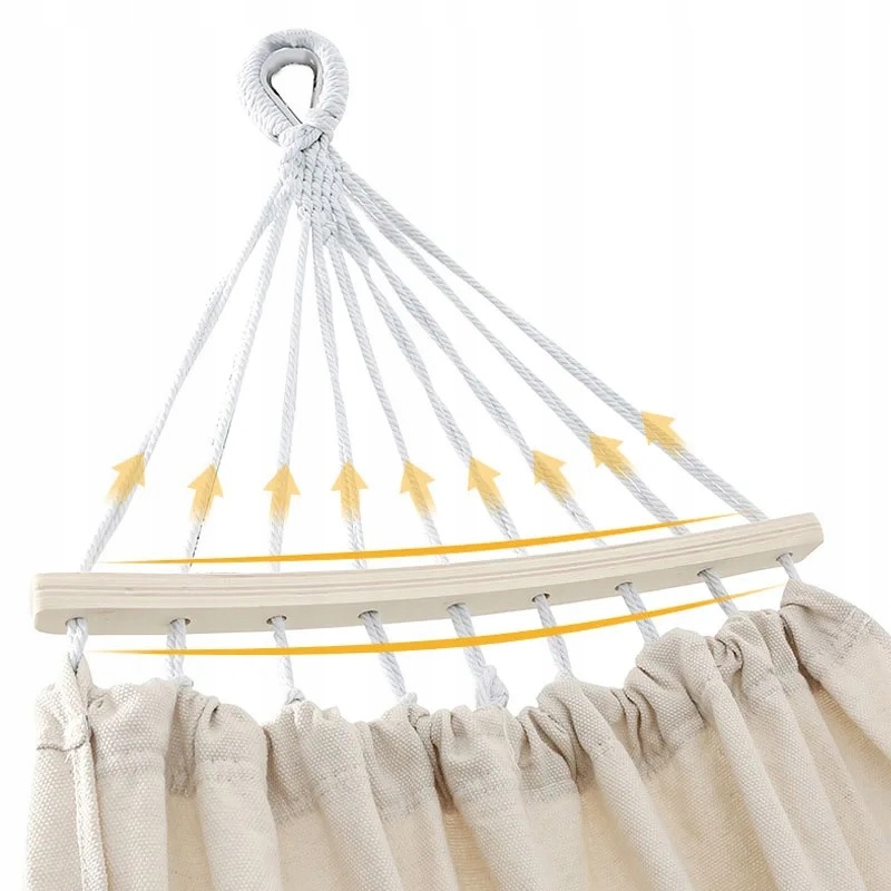 Ojačitvena lesena prečka zagotavlja enakomerno porazdelitev teže in zmanjšuje pritisk na določena področja viseče mreže.