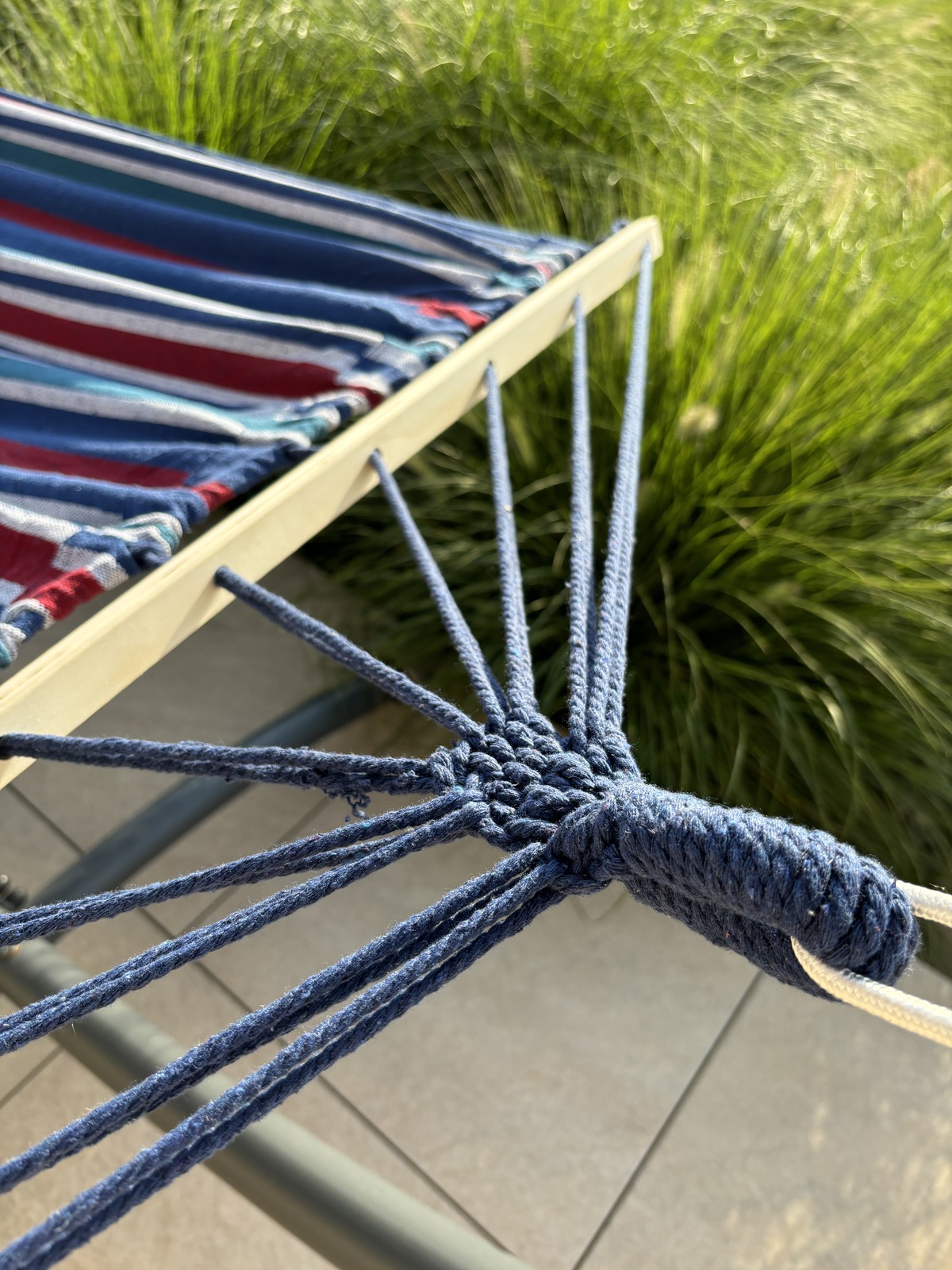 Debele pletene vrvi in trdna luknja za pritrditev zagotavljajo varnost in stabilno pritrditev viseče mreže.