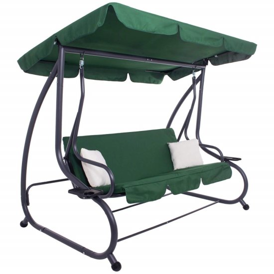 Udobna vrtna gugalnica za 4 osebe z udobnim sedežem, držali za skodelice, blazinami in funkcijo ležišča. Zelene barve, nosilnost 280 kg. Trdno ogrodje, odporno na poškodbe. Vodoodporen material. Zaščita pred korozijo. Nastavljiva streha. Vzmetna pritrditev. Nedrseče nogice.