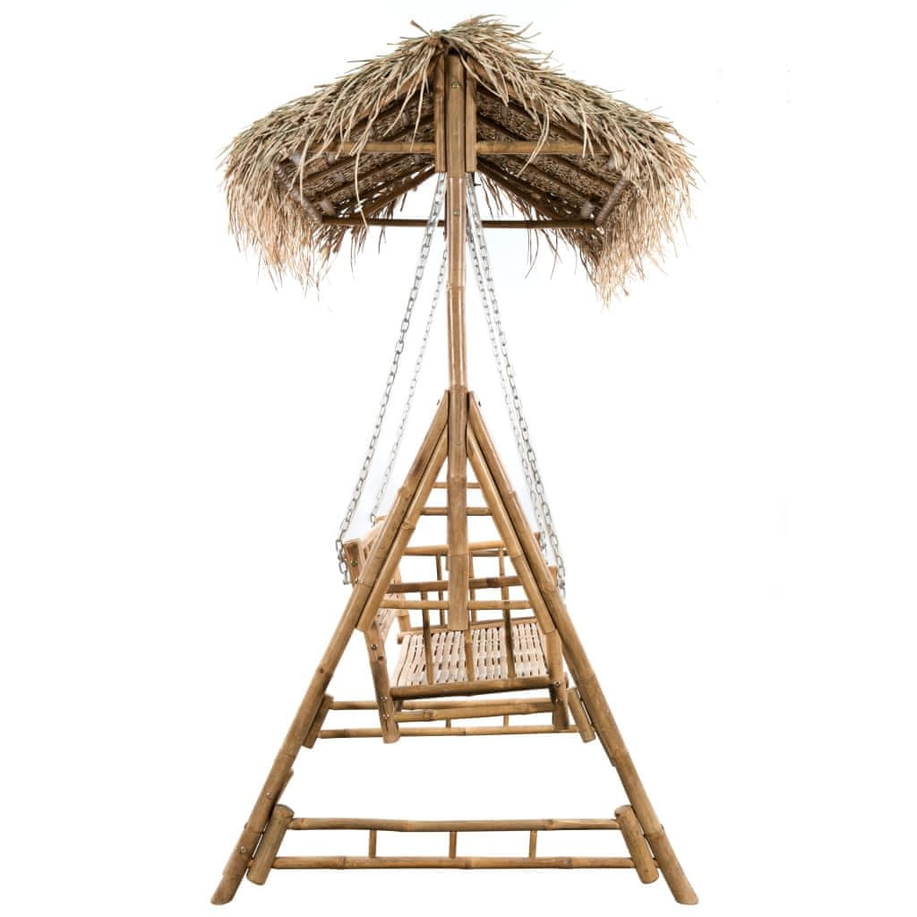Ta kakovostna gugalnica je izdelana iz trpežnega bambusa, ki je odporen na vremenske vplive, njena streha pa je pokrita s palmovimi listi, ki bodo vašemu zunanjemu prostoru dodali nekaj tropskega pridiha. Gugalnica visi s kovinskih verig, ki zagotavljajo optimalno varnost. Priložene blazine nudijo dodatno udobje med počivanjem. Vsaka blazina ima dva kompleta vrvic za trdno pritrditev na klop.