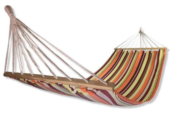 Narejena je iz močnega 100 % bombaža. Visokokakovosten in močan material bo poskrbel, da se boste v njej počutili udobno. Trdna lesena konstrukcija zagotavlja dolgo življenjsko dobo in varno uporabo. Hamaka je namenjena eni osebi z največjo težo 120 kg.