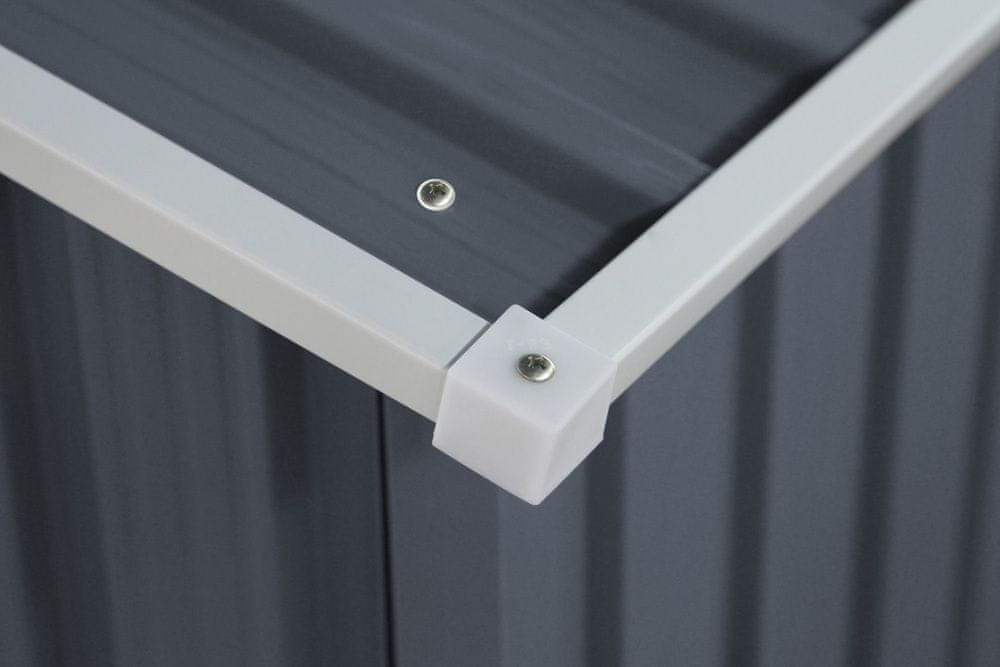 Vrtna hiša s kovinsko konstrukcijo jeklo. Pocinkana zaščita. Premer posamezne pločevine je 0,25 mm. Dvosmerna dostopna vrata v drsni tirnici. Zračniki za reden dostop do zraka. Oblikovanje v sivi barvi. Širina vrat je 117 cm. Skupna teža je 79 kg. Celoten opis