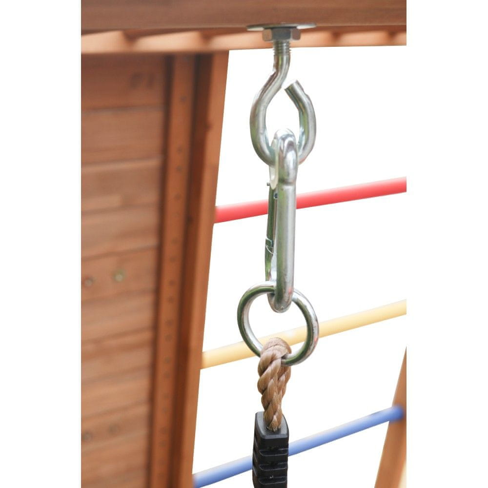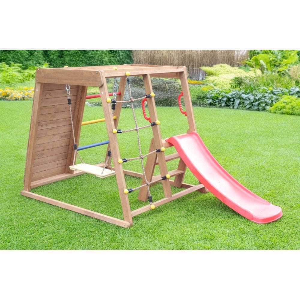 Otroško leseno igrišče FANKY je idealen kraj za vse otroke, stare od 3 do 12 let, ki obožujejo gibanje, pustolovščine in zabavo. Izdelano je iz trpežnega jelovega lesa z debelino konstrukcije 6×3 cm in materiala 1,5 – 1,8 cm, dopolnjenega s plastičnimi in jeklenimi elementi. Površina je obdelana z barvo na vodni osnovi, ki je prijazna do narave, v kombinaciji rjave barve in veselih večbarvnih detajlov pa deluje igrivo in privlačno. Vsi robovi so zaobljeni za maksimalno varnost. Igrišče ponuja številne možnosti za igro in razvoj motorike. Na eni strani se nahaja plezalna stena s pisanimi kamni (ŠxV): 58,5×107,5 cm in lestve z barvnimi palicami. Z nasprotne strani vodi vrvna lestev, ki razvija spretnost in koordinacijo. Otroci se do ploščadi pridejo po notranjih lesenih stopnicah z ročaji, od koder se lahko spustijo po toboganu z dimenzijami 37×120 cm. Pod ploščadjo je nameščena gugalnica z lesenim sedežem (ŠxGxV): 43,5×17,5×83 cm, idealna za trenutke, polne smeha in gibanja. Dimenzije celotnega igrišča so (ŠxGxV): 123×135×120 cm, zaradi česar je dovolj prostorno za igro več otrok hkrati. Maksimalna nosilnost je 60 kg na osebo, konstrukcija pa je odporna na vremenske in klimatske vplive, zato je lahko nameščena zunaj celo leto. Za varnost je priporočljiva montaža na površino, ki absorbira udarce (pesek, sekanci, guma, pena), in redni pregled vsake 3 mesece. Igralo je dobavljeno razstavljeno in brez talne obloge. Leseno igrišče Fanky otrokom prinaša varen prostor, poln gibanja, smeha in domišljije kar na vašem vrtu.