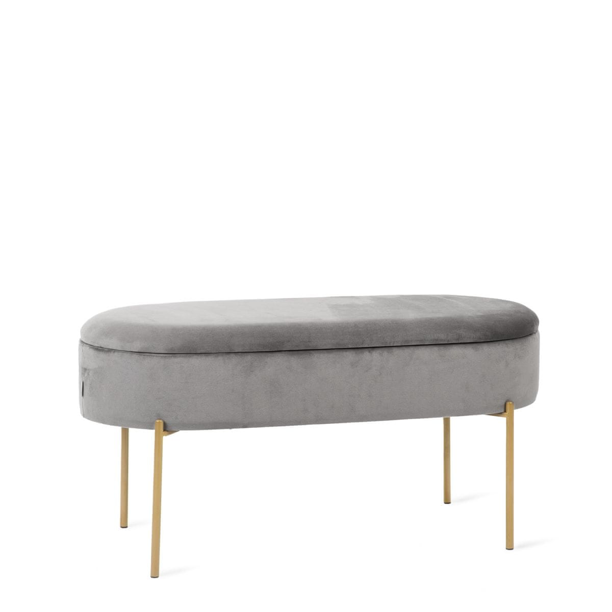 Klop LAYLA je zelo funkcionalna, zahvaljujoč predalu za shranjevanje pod sedežem. Podolgovata klop je v sivi barvi. Elegantno klop dopolnjujejo zlate noge. Celota ustvarja povezano in zanimivo kompozicijo. Klop ima kompaktne dimenzije.