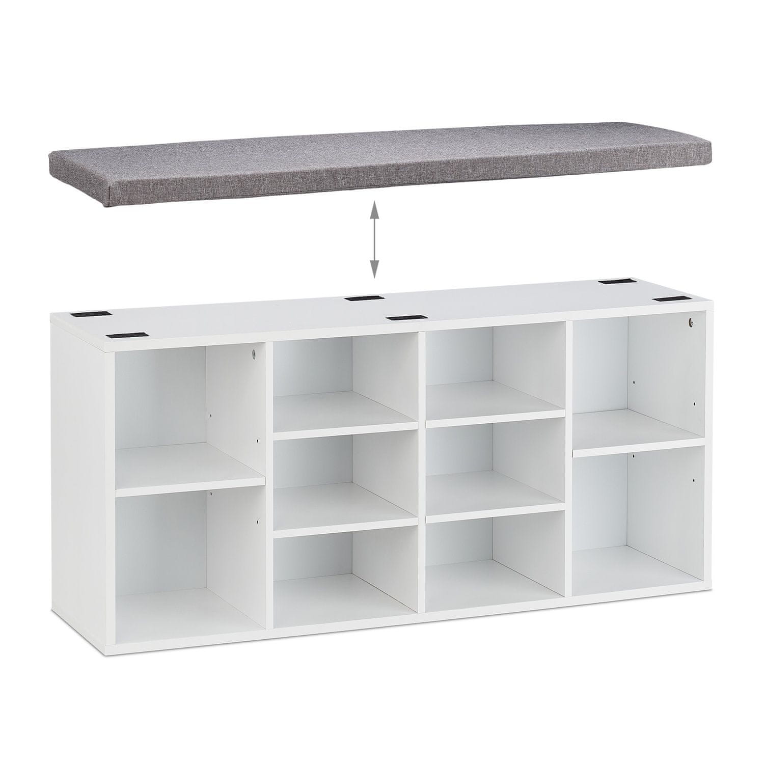 Optimizirajte svoj vhod s to sodobno garderobno klopjo, ki ponuja učinkovito shranjevanje čevljev in eleganten dizajn. Z 10 prostornimi predelki je vaša obutev organizirana in dostopna.