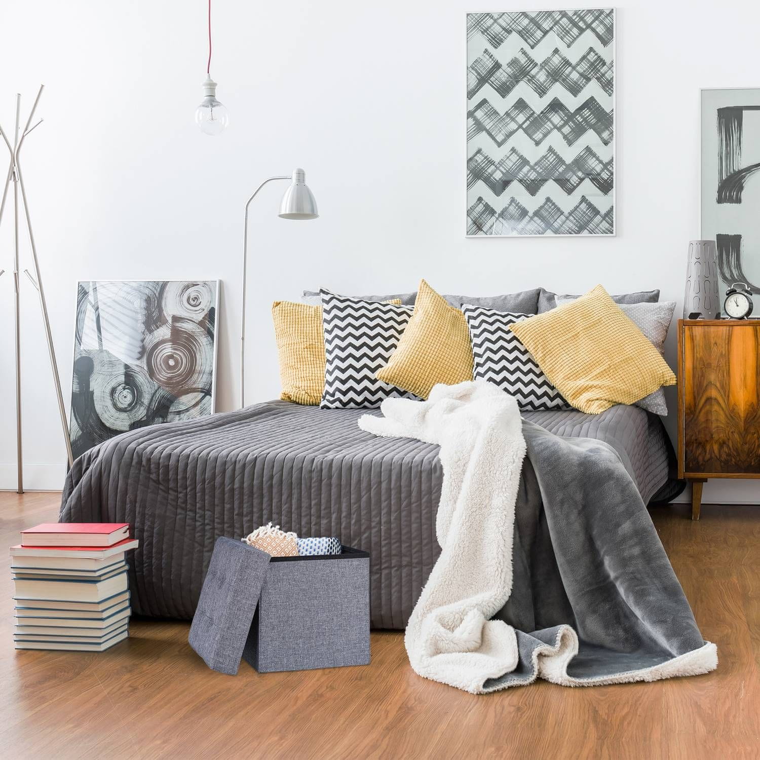 Zložljiv oblazinjen stolček za shranjevanje ponuja udobje pametnega doma s svojo dvojno funkcijo kot sedež in rešitev za shranjevanje. Idealno za organiziranje odej, igrač in drugega v kompaktnih prostorih.
