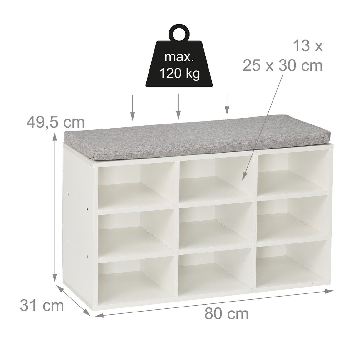 Eleganten organizator za čevlje z več odprtimi predelki za shranjevanje in udobnim sedežem z sivo blazino. Idealna za hodnike, verande ali spalnice, ponuja kombinacijo praktičnosti in stila za vsak prostor. Celoten opis
