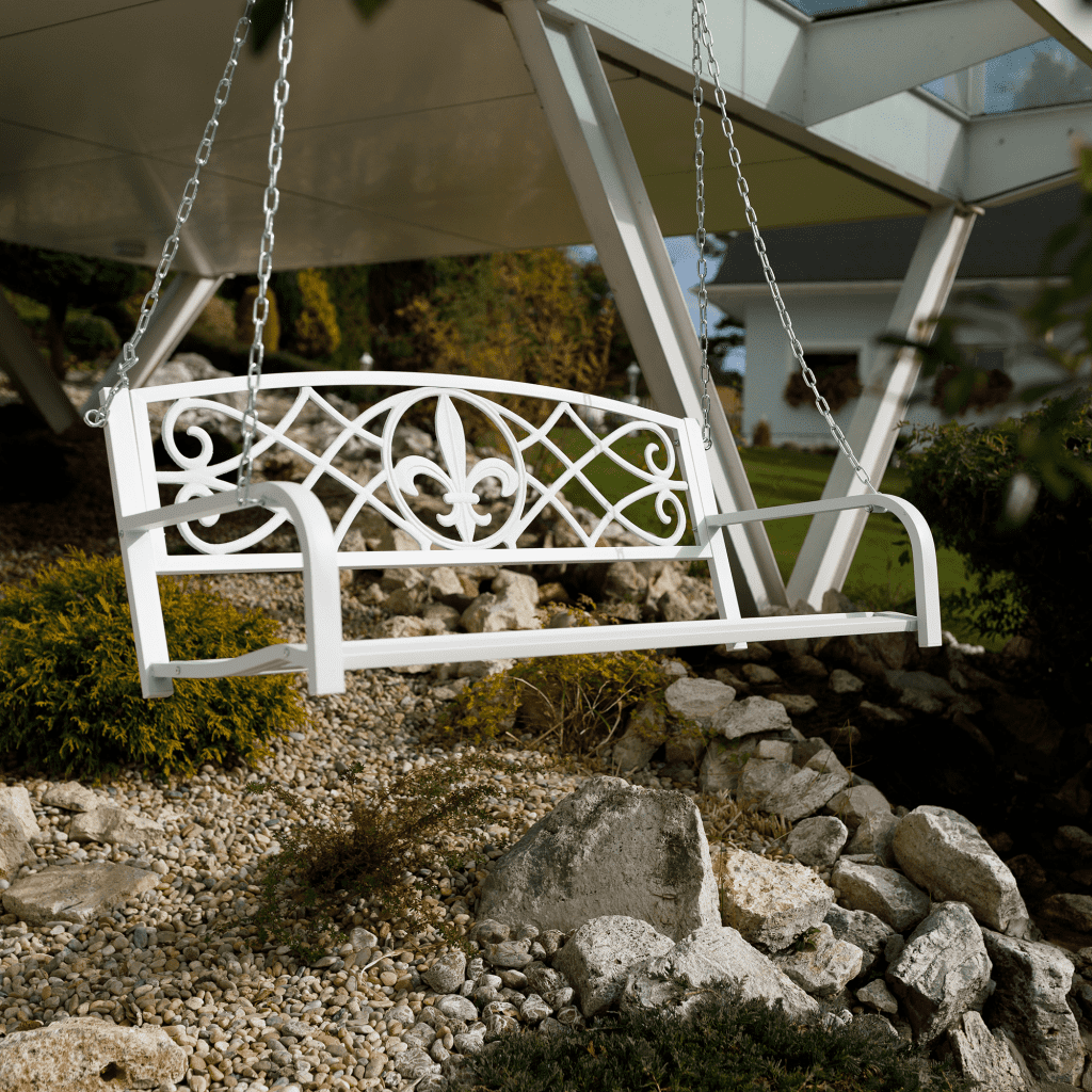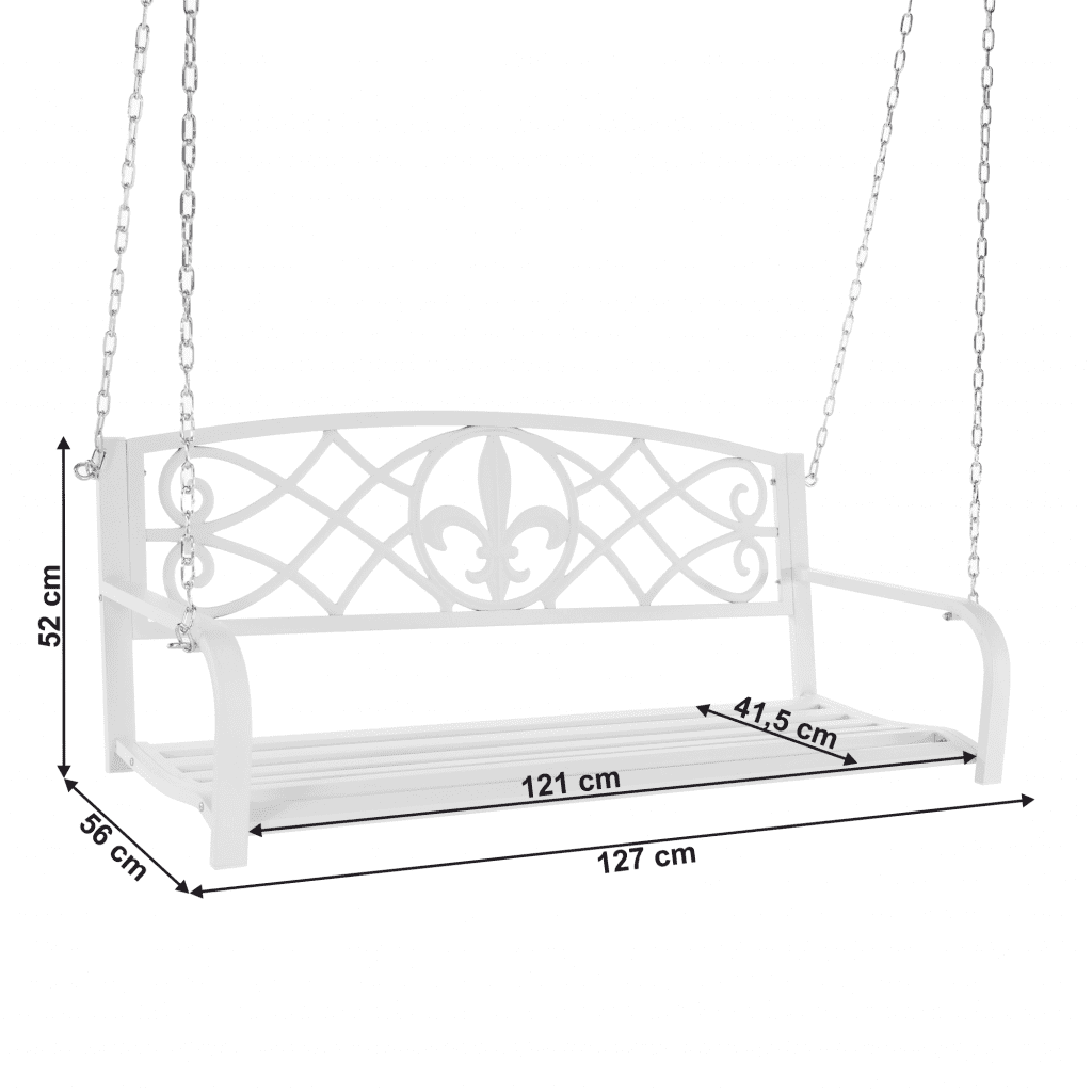 Material: jeklo Barva: bela Dimenzije (ŠxVxV): 127×56×52 cm Širina sedeža: 121 cm Globina sedeža: 41,5 Nosilnost: 170 kg Z verigo Dolžina verige: 3,4 m romantično oblikovanje Okraski na naslonjalu Primerno za uporabo v zaprtih prostorih in na prostem Za balkone, terase, vrtove Dobavljeno brez Celoten opis