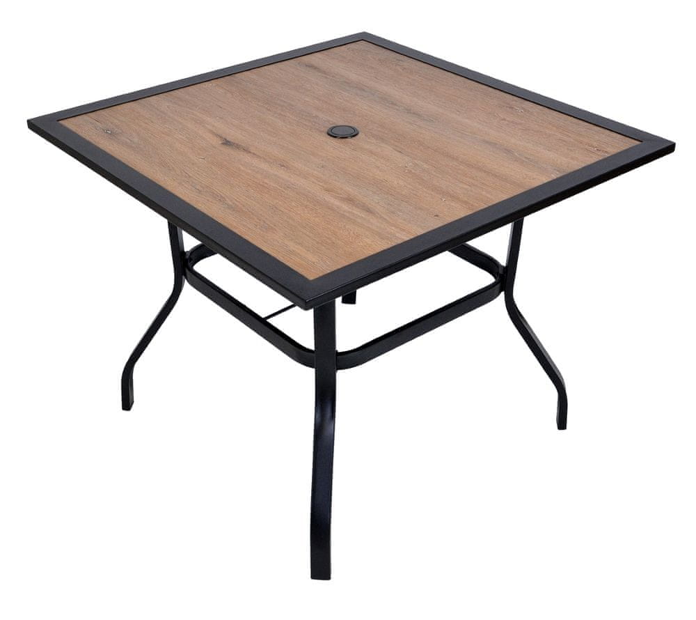 Vrtna miza združuje stabilno jekleno konstrukcijo in estetsko dovršeno ploščo v dekorju lesa. Jekleno ogrodje je zaščiteno s črnim prašnim barvanjem, kar zagotavlja dolgo življenjsko dobo in odpornost na zunanje vplive. Celoten opis