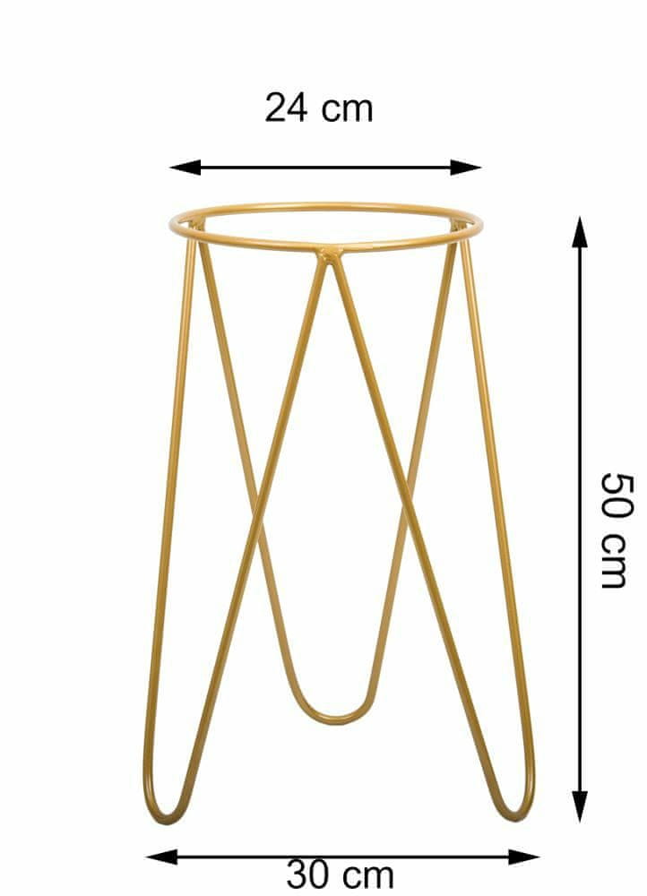 Moderno samostoječe stojalo za rastline v slogu podstrešja. Zahvaljujoč svoji preprostosti in edinstvenemu dizajnu bo to stojalo dopolnilo vsak stil stanovanja, sobe ali hiše. Zaradi robustne in vzdržljive konstrukcije je primeren tudi za balkone, vrtove, gazebose ali verande. Stojalo je izdelano iz prašno barvane jeklene žice, zaradi česar je odporno na zunanje dejavnike in deformacije. Stojalo je vzdržljivo, lahko in stabilno, zaradi česar je vsestransko uporabno za uporabo v domovih in na vrtovih. Stojalo za rastline je zlate barve. Višina: 45 cm, širina: 30 cm, premer lončka: 24 cm