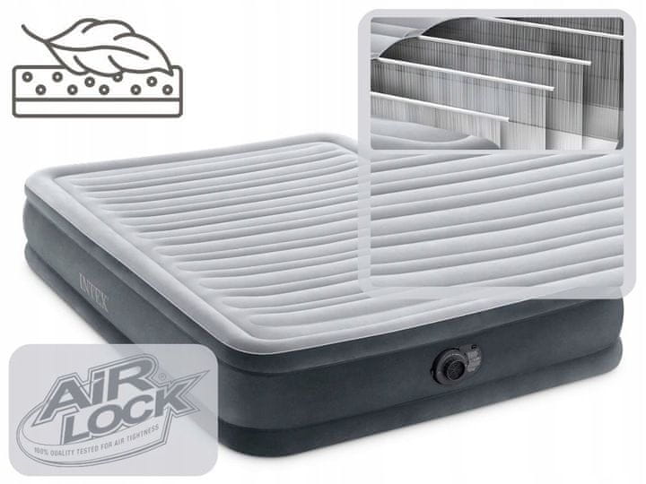 Vzmetnica Air Bed Comfort-Plush znamke Intex je odlična izbira za tiste, ki iščejo udoben prostor za počitek zase ali za goste, ki ga je enostavno napihniti, izprazniti in prevažati. Zaradi svojih dimenzij lahko udobno sprejme dve osebi, kar jima zagotavlja dovolj prostora za udoben počitek. Vzmetnica ima s strani proizvajalca certifikat AirLock, kar pomeni, da je bila pred izhodom iz tovarne preizkušena na tesnjenje.
