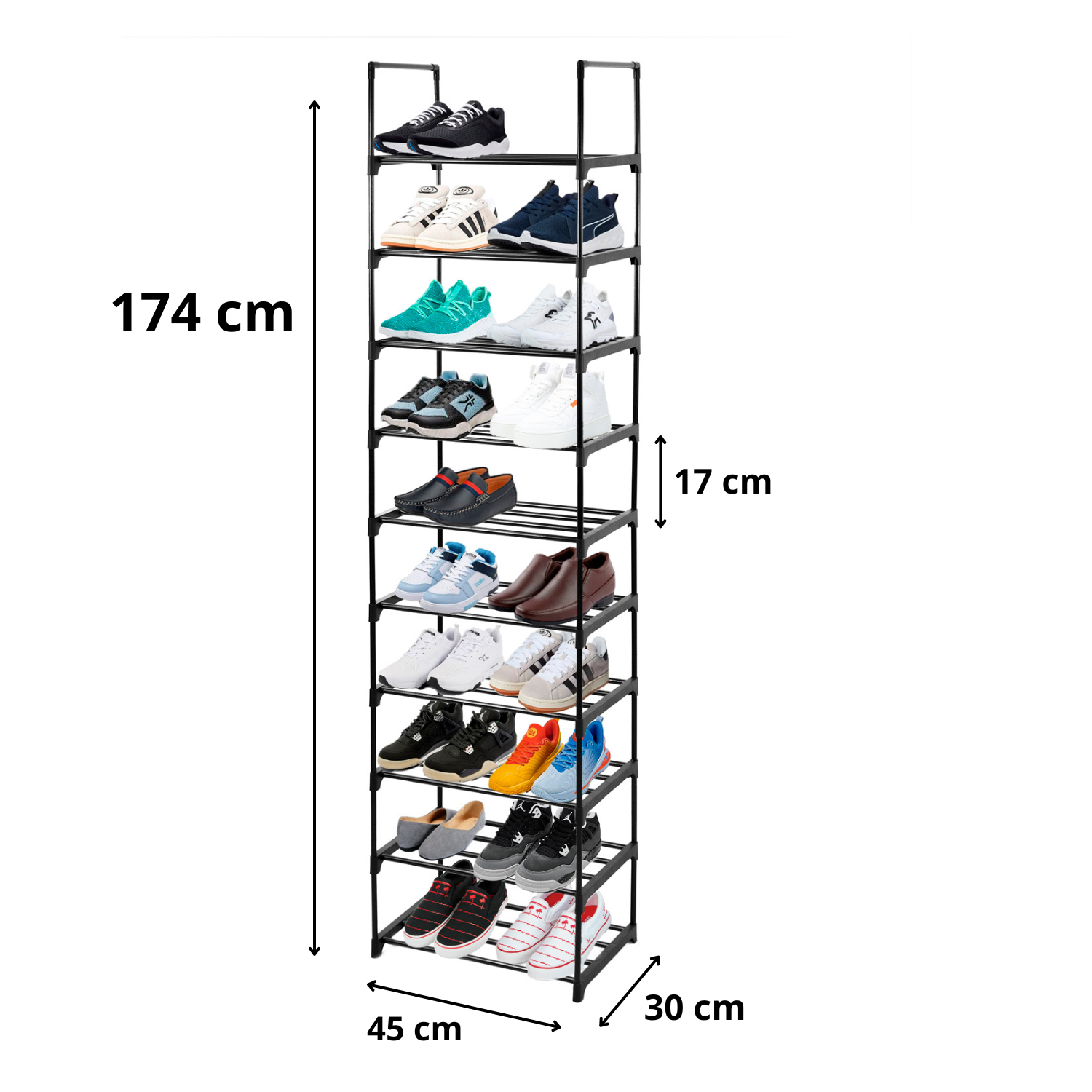 Police velikosti 45 × 30 cm in 17 cm prostora med njimi omogočajo priročno shranjevanje čevljev, kovinske cevi pa zagotavljajo stabilnost. Vsaka polica lahko prenese obremenitev do 5 kg, kar pomeni, da lahko shranite ne le obutev, temveč tudi druge dodatke. Če potrebujete več prostora za čevlje, preprosto ne namestite eno polico in ustvarite prostor za škornje ali gumijaste škornje.