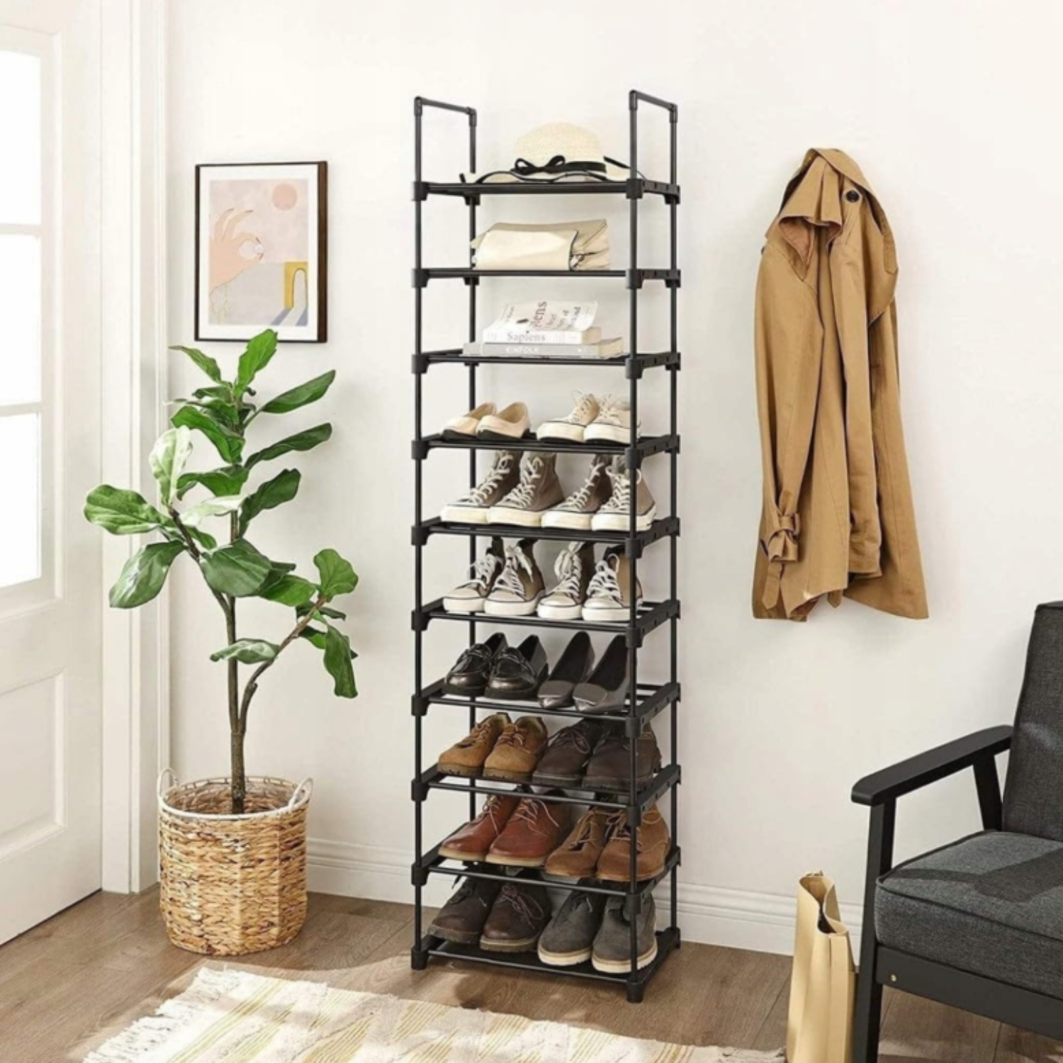 shumee Ozka omarica za čevlje, kovinska polica, zložljivo stojalo za čevlje, črno ogrodje