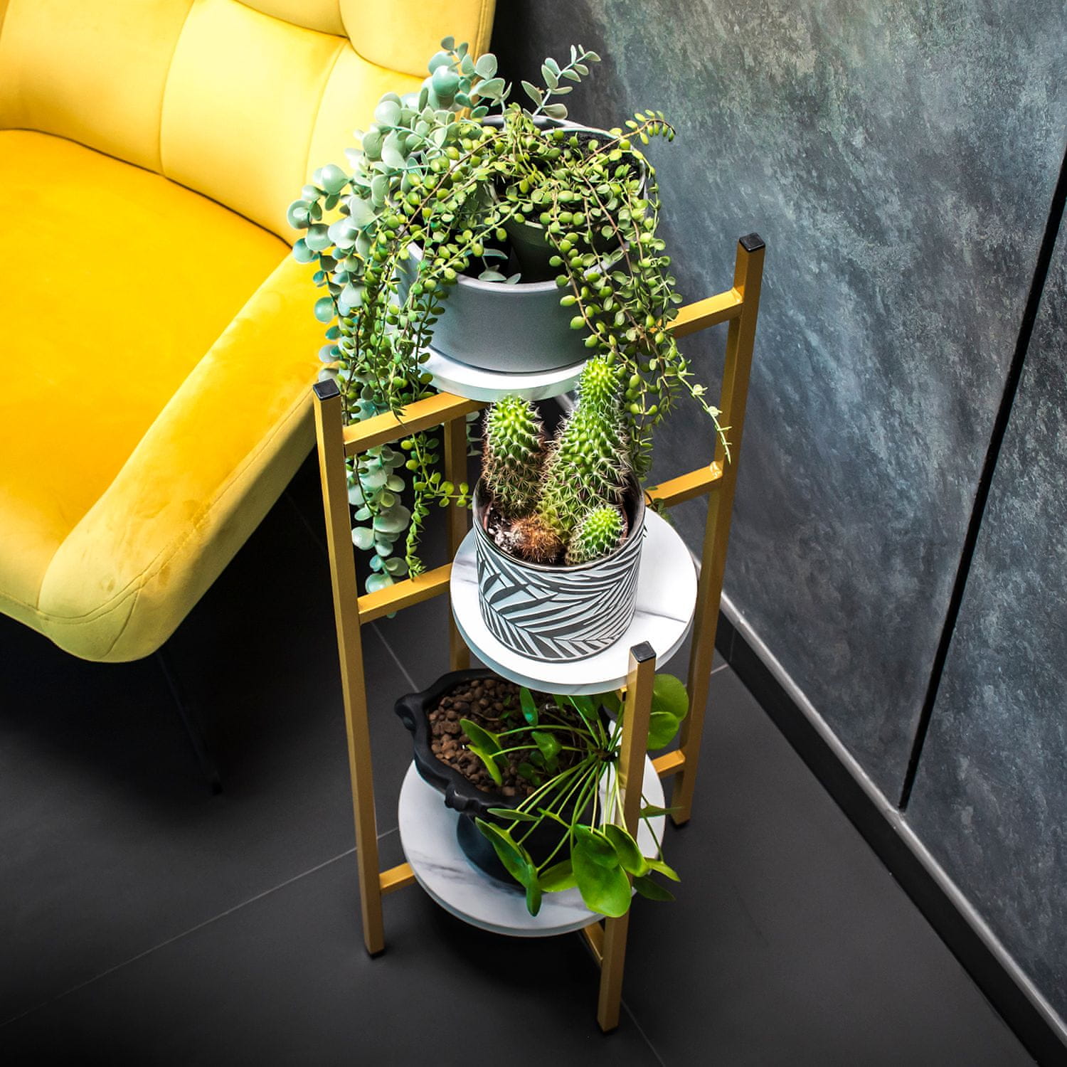 ✨ Zahvaljujoč trdni konstrukciji in policam je stojalo za rože stabilno, vzdržljivo in se prilega sodobnim aranžmajem.