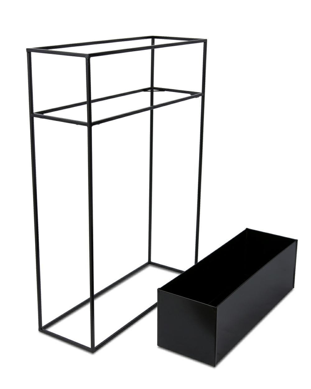 Moderno samostoječe stojalo za rastline v slogu podstrešja. Zahvaljujoč svoji preprostosti in edinstvenemu dizajnu bo to stojalo dopolnilo vsak stil stanovanja, sobe ali hiše. Zaradi robustne in vzdržljive konstrukcije je primeren tudi za uporabo na balkonu, vrtu, gazebu ali verandi. Stojalo je izdelano iz praškasto lakirane jeklene žice, zaradi česar je odporno na zvijanje. Vzdržljivo, lahko in stabilno stojalo je primerno za univerzalno uporabo doma ali na vrtu. Stojalo ima odstranljivo škatlo. Škatla ni vodoodporna, zato rastlin ali rož ne smete saditi neposredno v škatlo. Izdelek ni odporen na vremenske vplive. Predstavljeno stojalo za rastline je črne barve. Mere: Višina: 90 cm Širina: 64 cm Globina: 24 cm Globina škatle: 20 cm Zaradi ročne izdelave se lahko dimenzije razlikujejo za 2–3 cm.